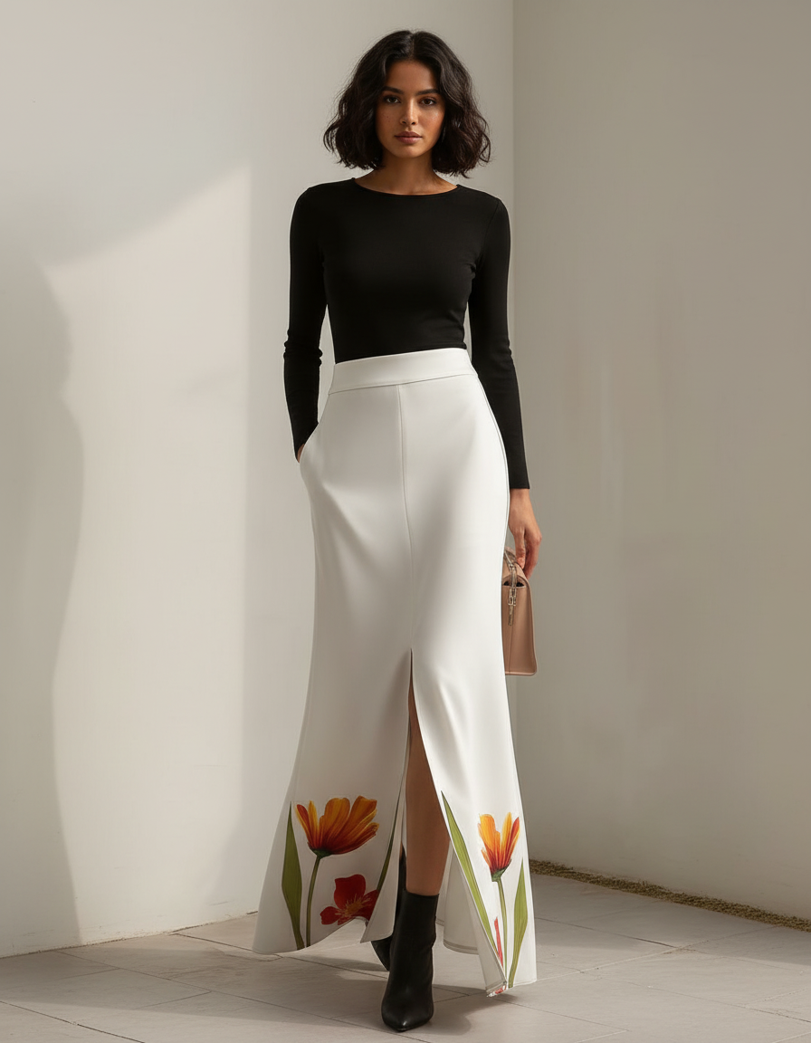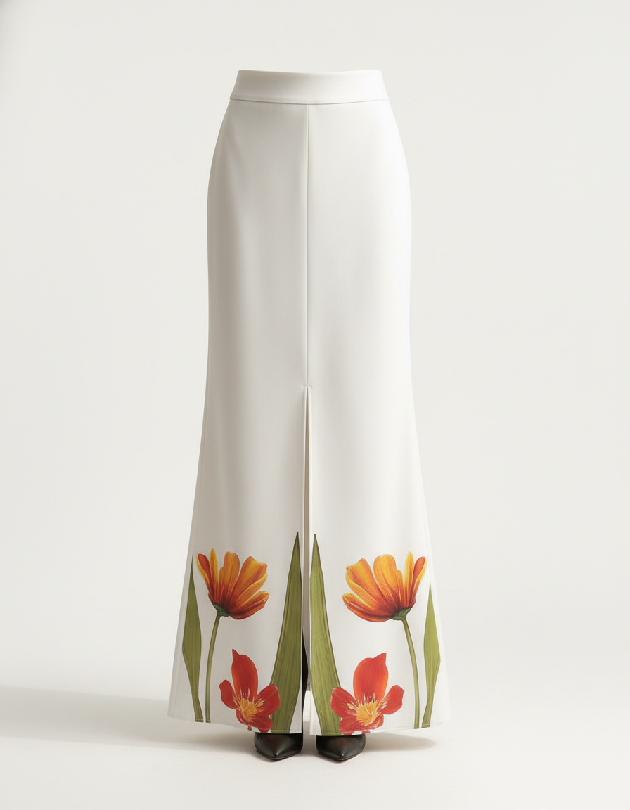 Ce qui la distingue véritablement, c'est son design avant-gardiste : une fente élégante qui dévoile subtilement la jambe et un motif floral délicat, inspiré des tulipes flamboyantes, qui borde l'ourlet. Ces touches artistiques transforment une jupe classique en une œuvre d'art portable, apportant une dimension de fraîcheur et d'originalité. Confectionnée dans un tissu haut de gamme pour un tombé impeccable et un confort absolu, la Jupe Longue Blanche Fendue est l'incarnation même du luxe discret et de l'innovation stylistique. Une pièce unique qui célèbre la féminité avec une touche de poésie moderne.