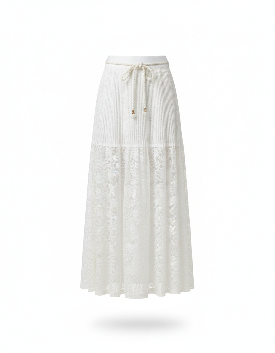 Cette jupe longue est de couleur blanche et présente un motif en dentelle. Sa conception inclut des zones transparentes.