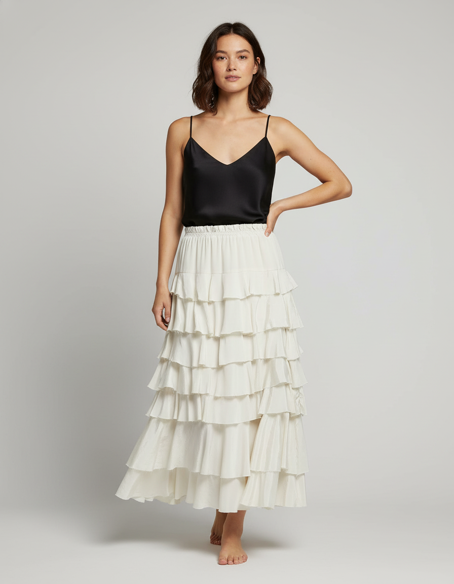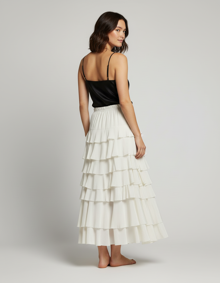 Cette jupe longue blanche à volants est parfaite pour un look élégant et décontracté.