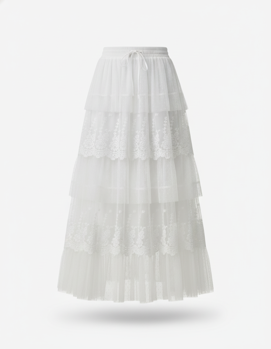 Une jupe longue à volants de couleur blanche. Elle présente des empiècements en dentelle et est confectionnée en tissu de type mousseline.