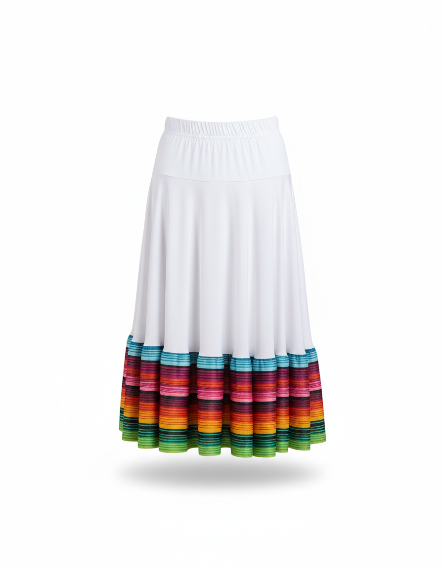Cette jupe est une pièce de vêtement de danse pour femme. Elle est de couleur blanche avec des rayures multicolores situées sur l'ourlet inférieur et présente une taille haute.