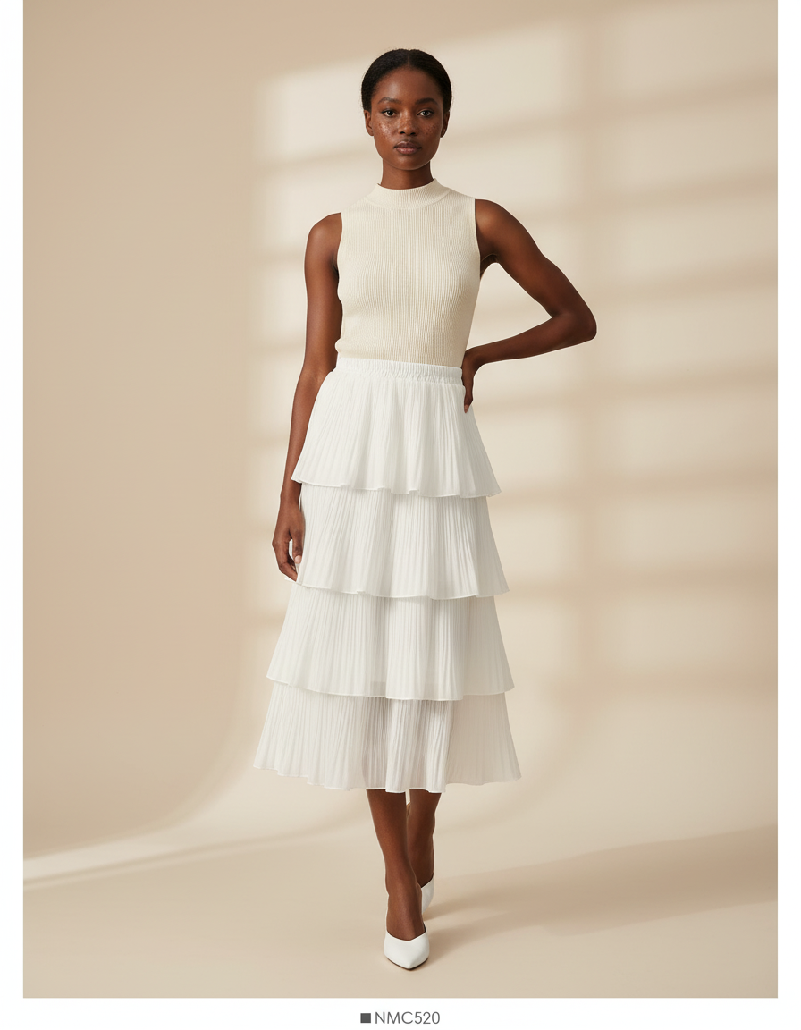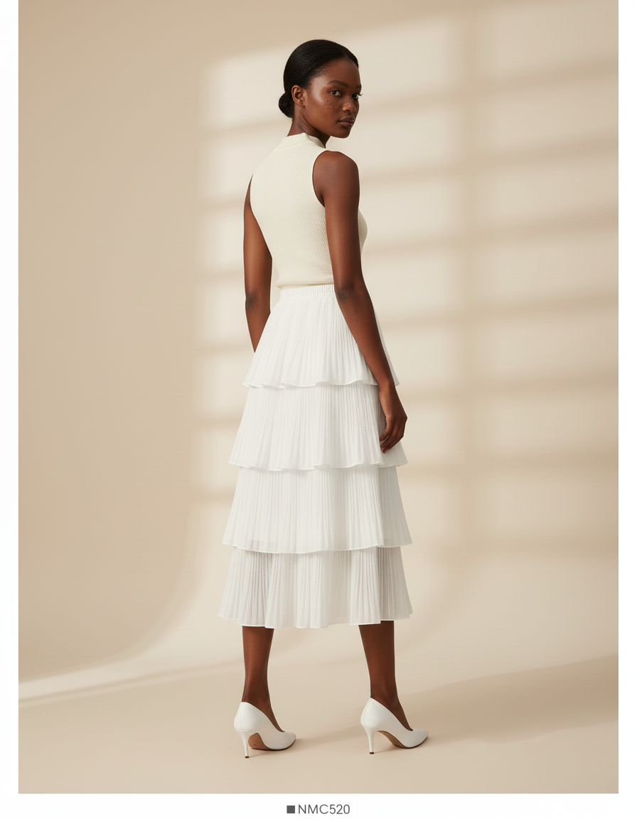 Conçue pour les célébrations et les événements distingués, notre Jupe Longue Blanche Plissée Fluide Élégante est une pièce maîtresse de votre garde-robe. Sa mousseline vaporeuse, d'un blanc pur, épouse la silhouette avec une grâce aérienne, tandis que ses plis délicats confèrent une texture riche et un mouvement captivant à chaque pas. Idéale pour une cérémonie de mariage en plein air, une garden party sophistiquée ou un cocktail estival, elle se prête à une multitude d'interprétations stylistiques. Associez-la à un top en soie ajusté et des sandales fines pour un look invité impeccable, ou à un crop top en maille et des talons compensés pour une allure plus décontractée mais toujours chic.