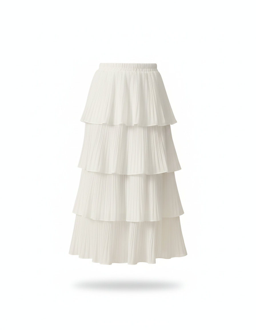 Cette jupe longue blanche plissée est dotée de quatre couches à volants. Elle est conçue avec une taille haute et un tissu qui permet un tombé fluide.
