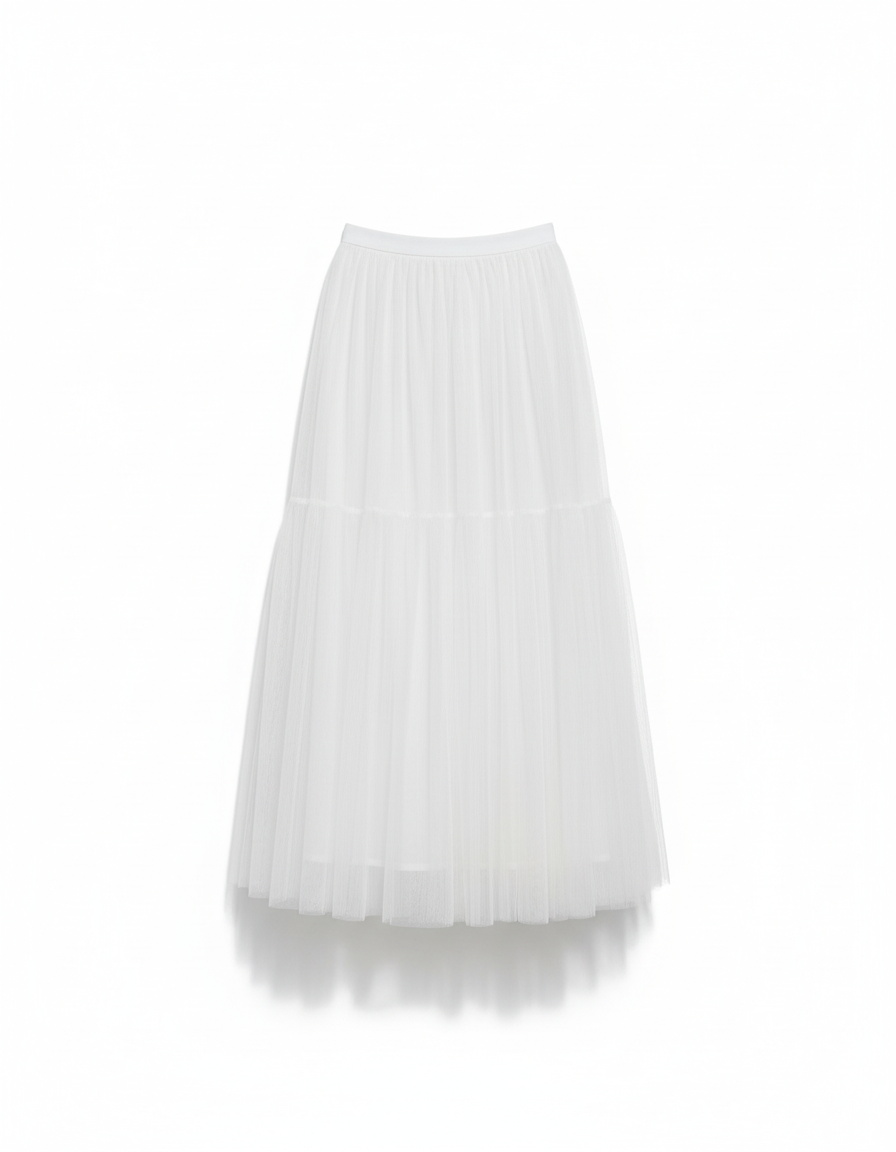 Ajoutez une touche de grâce et de légèreté à votre style avec notre sublime jupe longue blanche en tulle plissé.
