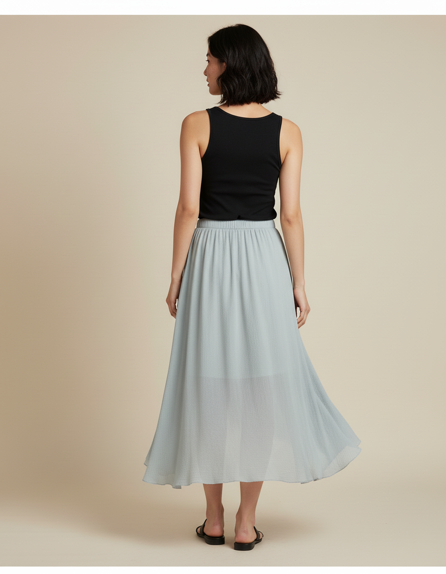 Cette Jupe Longue Bleu Clair Irrégulière Fluide peut être portée pour une tenue quotidienne ou des sorties décontractées. Sa coupe fluide est adaptée aux contextes estivaux.