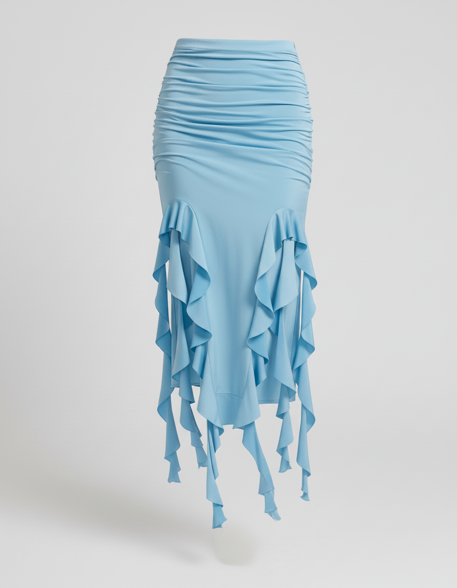 Cette jupe longue présente une couleur bleu clair avec des détails de ruching sur le corps et des volants asymétriques à l'ourlet.