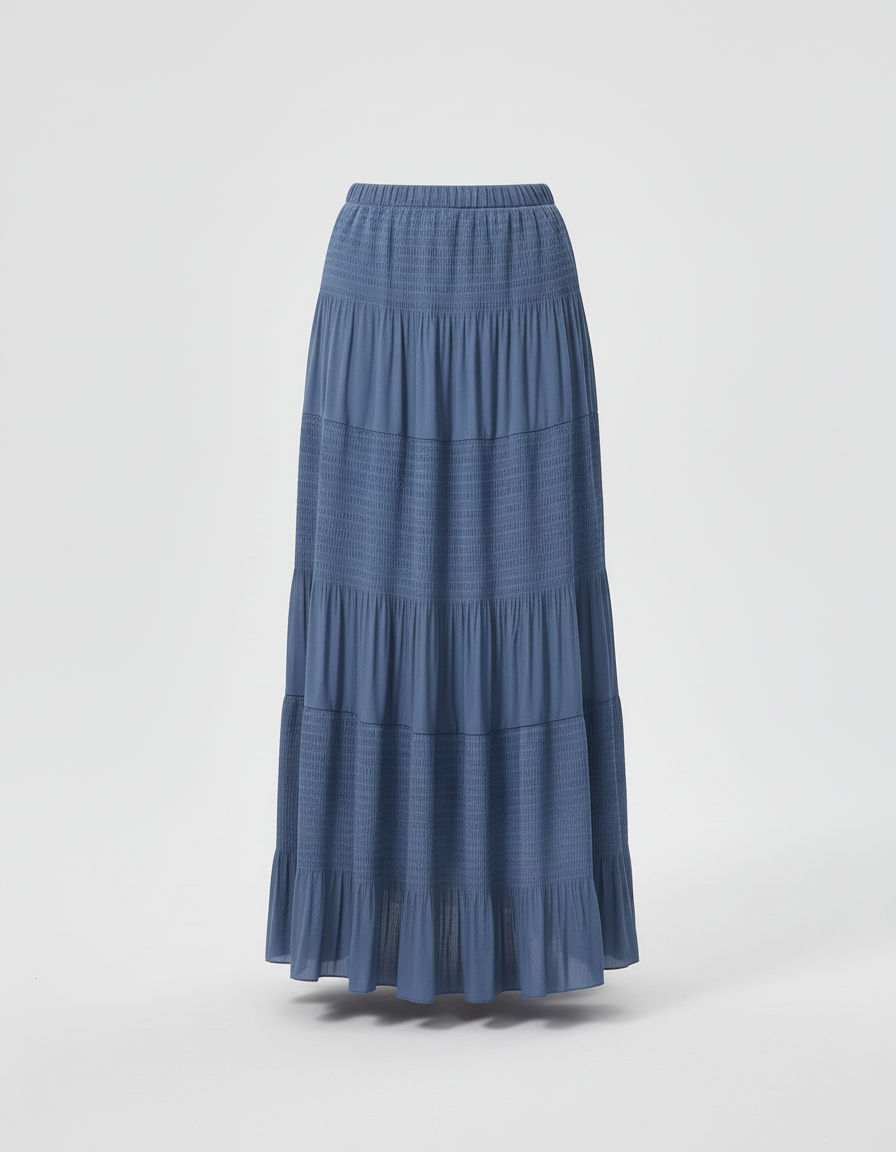 Cette jupe longue bleu jean présente une taille haute élastique et une coupe évasée en A. Elle est conçue avec des plis et des volants superposés, atteignant la longueur cheville.