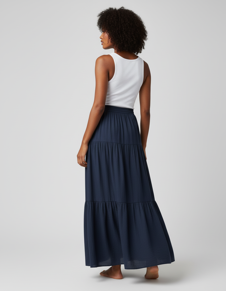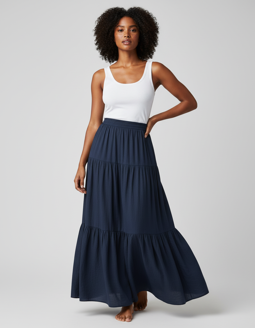Adoptez le confort et le style avec notre jupe longue bleu marine à volants.