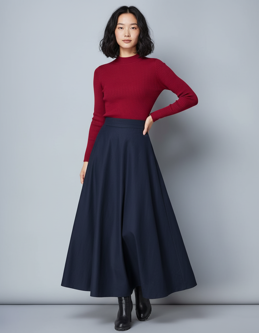 La Jupe Longue Évasée Ample se prête à une multitude d'interprétations stylistiques. Pour une allure décontractée chic, associez-la à un pull en maille côtelée près du corps et des bottines, comme ici, pour une silhouette moderne et confortable. En journée professionnelle, elle se marie parfaitement avec une chemise fluide et un blazer ajusté, offrant une prestance impeccable. Pour une soirée spéciale, osez un top en soie ou un chemisier délicat, rehaussé de bijoux discrets, pour une élégance intemporelle. Sa couleur bleu marine profonde en fait une toile de fond idéale pour toutes vos envies, des plus classiques aux plus audacieuses.