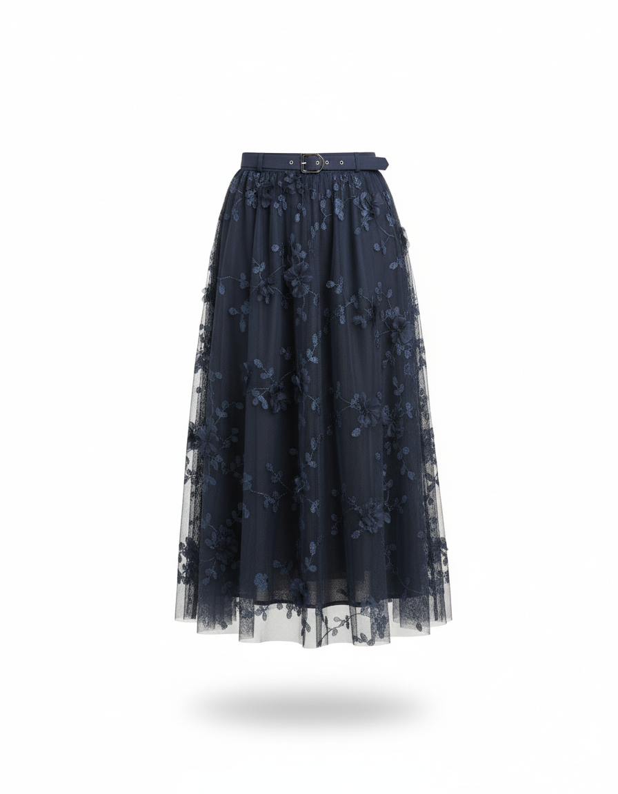 Jupe Longue Bleu Marine Fleurie en Tulle Brodé