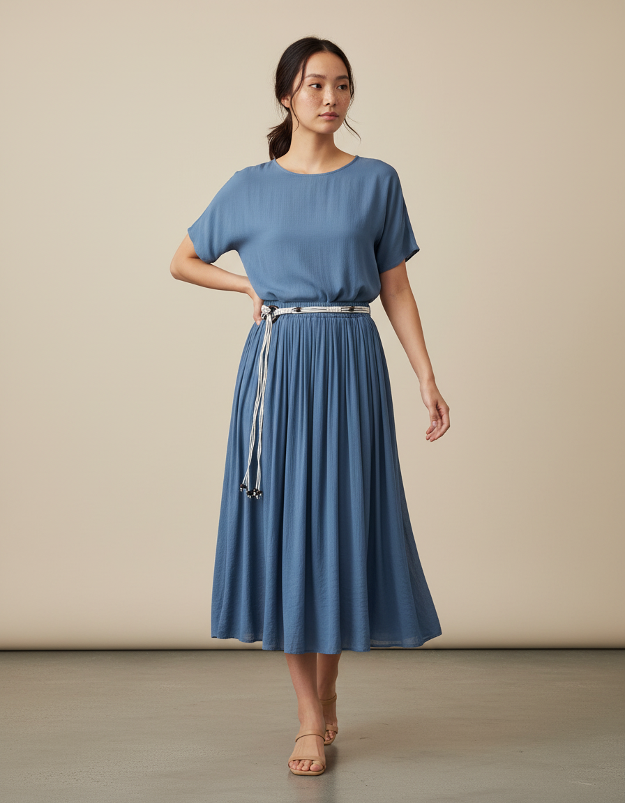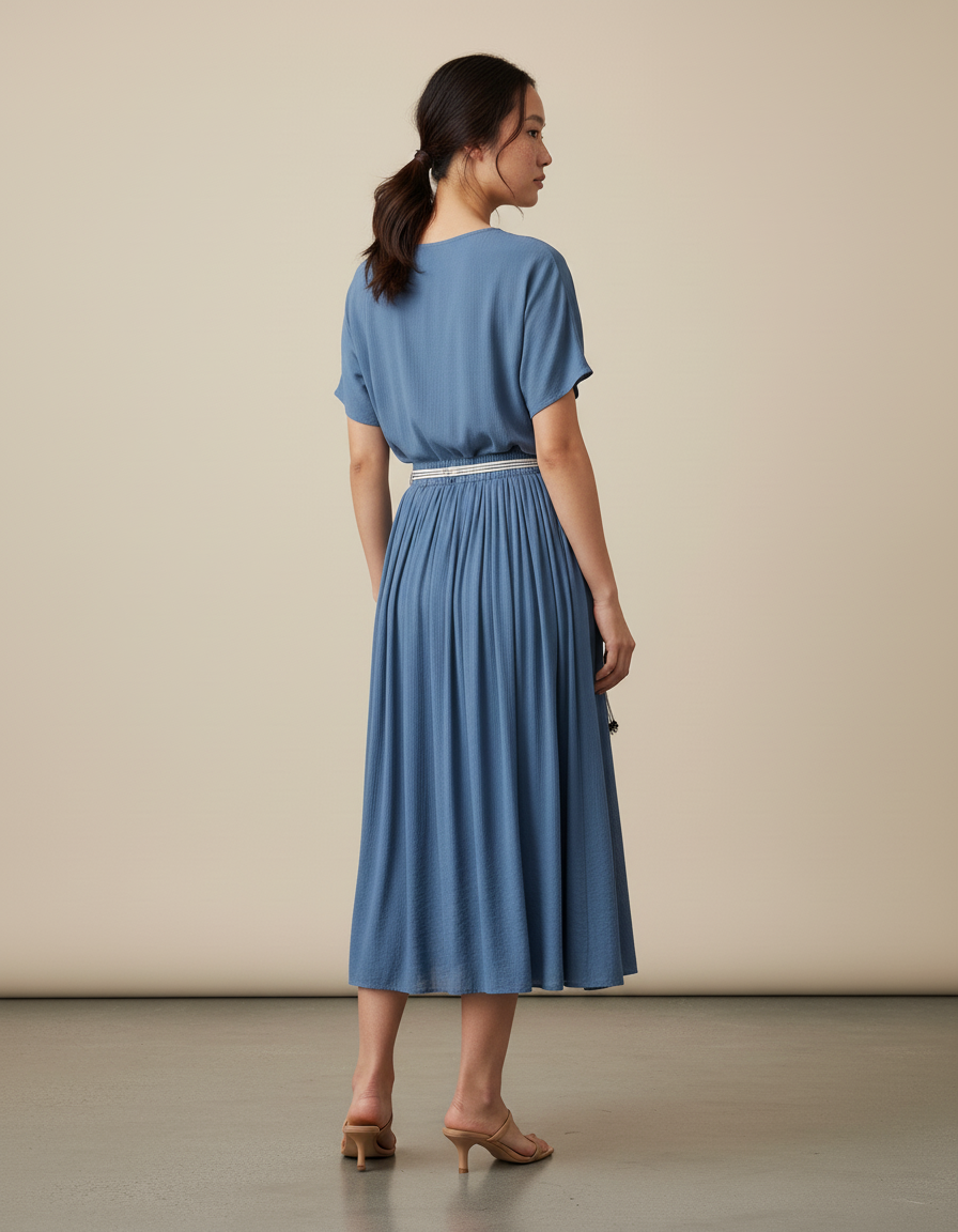 Découvrez notre robe midi décontractée, dotée d'une jupe longue plissée d'un bleu tendance.