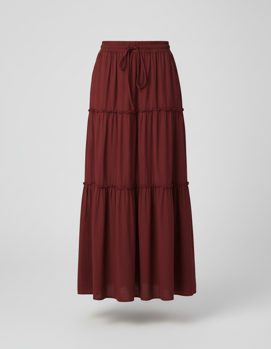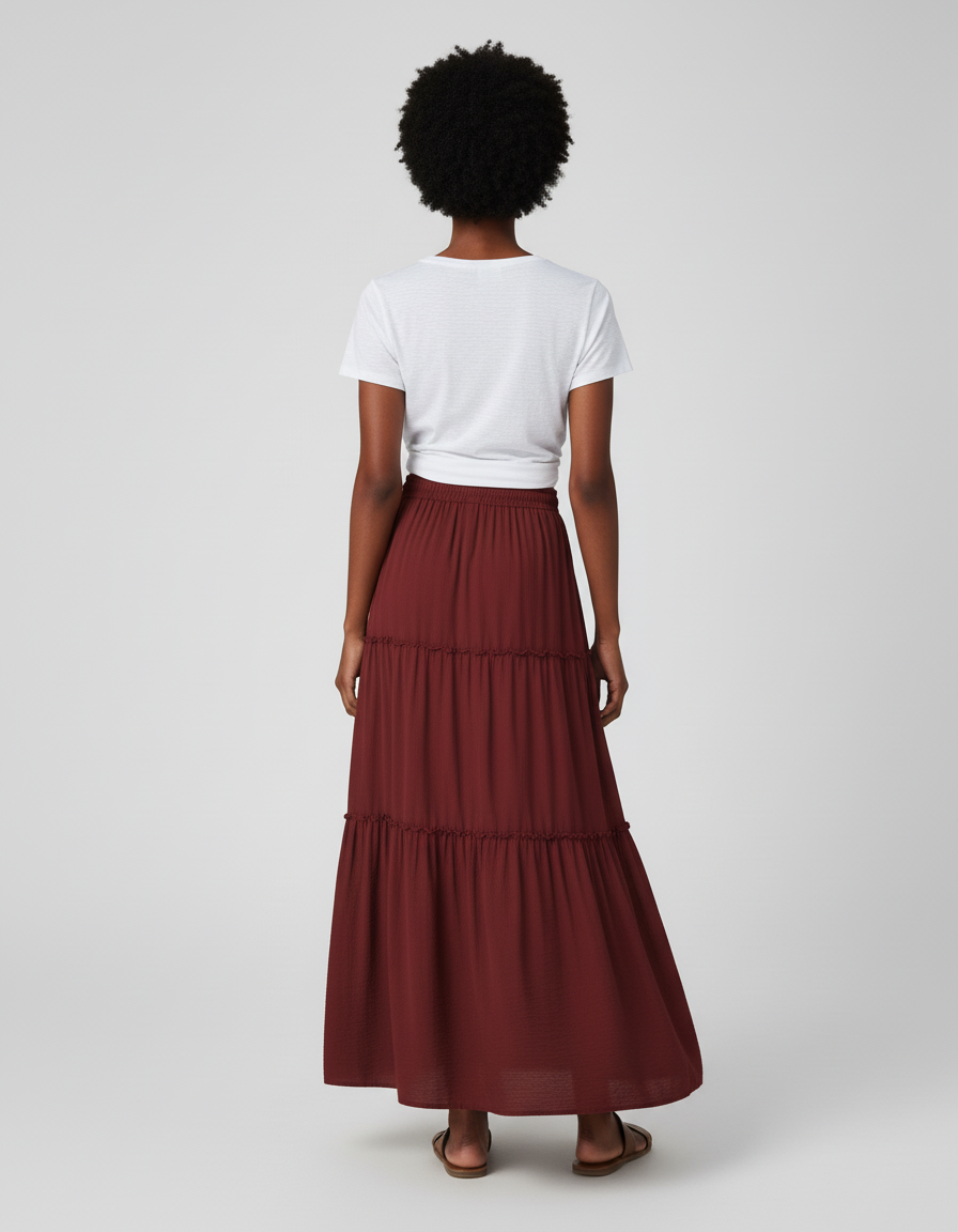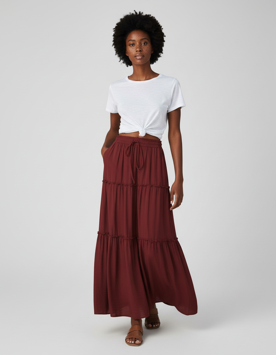 Découvrez notre jupe longue bohème bordeaux à volants, parfaite pour un look décontracté et élégant.