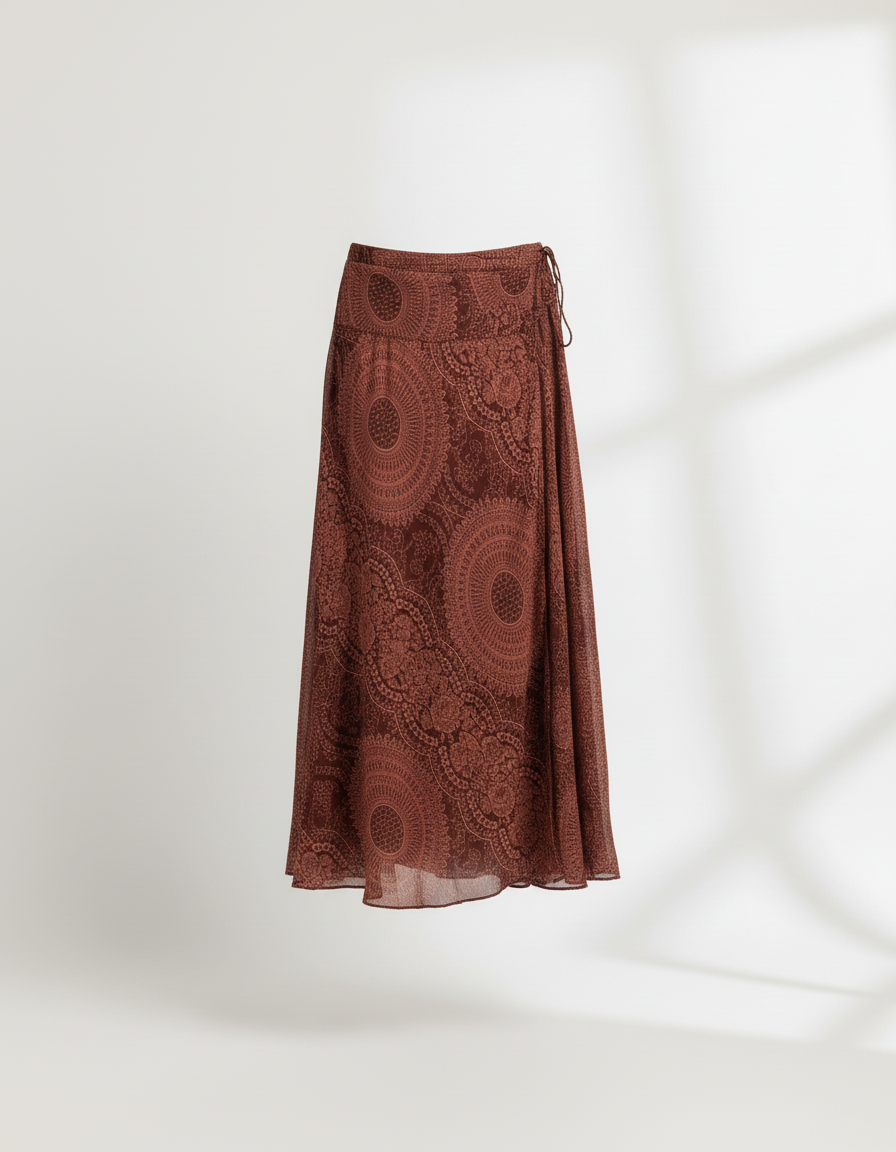 Cette jupe longue présente une coupe fluide et un motif imprimé. Sa couleur est un marron tirant sur le roux.