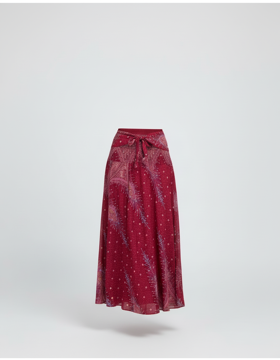 Cette jupe longue présente une couleur rouge avec un motif imprimé. Elle est caractérisée par une coupe évasée et un lien à nouer à la taille.