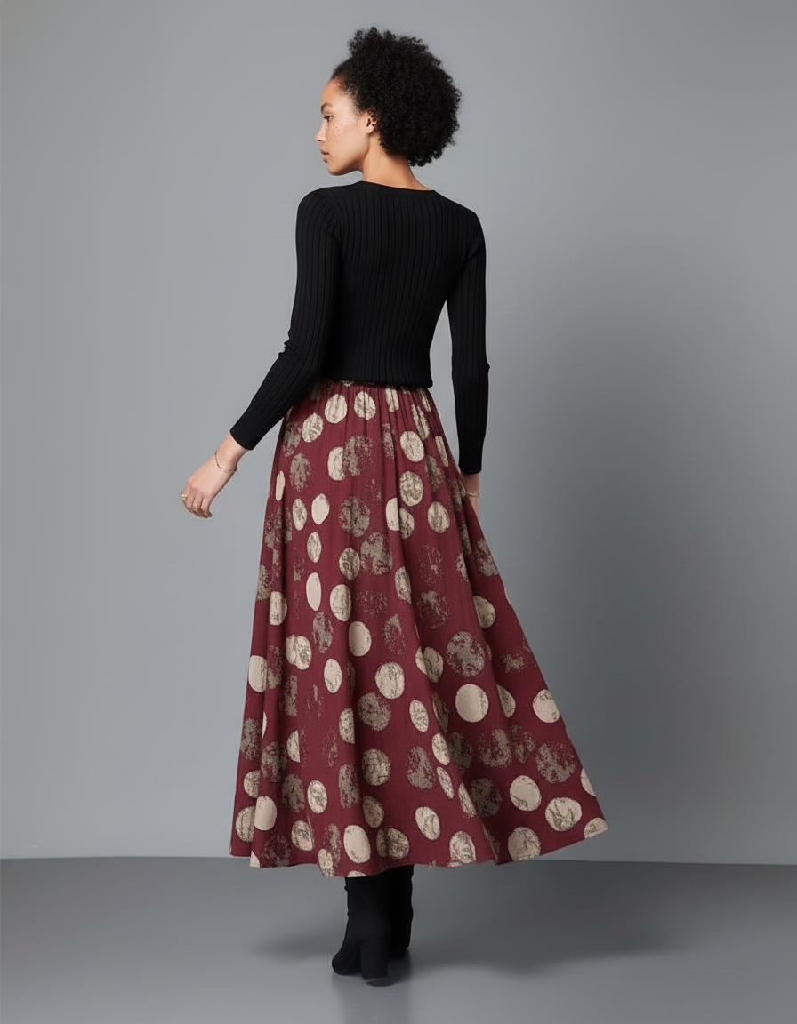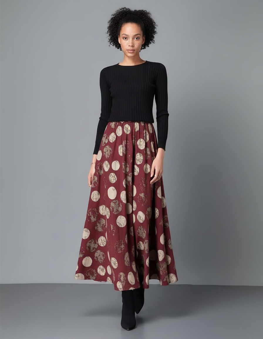 Cette jupe longue présente un motif de cercles imprimés sur un fond bordeaux. Sa coupe est conçue pour offrir un tombé fluide.