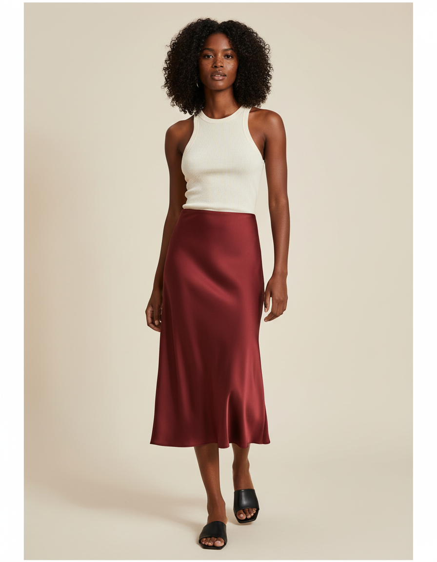 Du dîner élégant à l'événement spécial, sa couleur bordeaux profonde et son éclat subtil en font une pièce maîtresse facile à styliser. Pour une allure sophistiquée, associez-la à un top délicat et des talons fins. Pour une touche plus moderne et décontractée chic, osez un pull en cachemire ou un caraco en soie, complété par des sandales minimalistes comme celles de notre modèle. Cette jupe est une invitation à exprimer votre style personnel, offrant une transition fluide entre les occasions, toujours avec distinction et raffinement.
