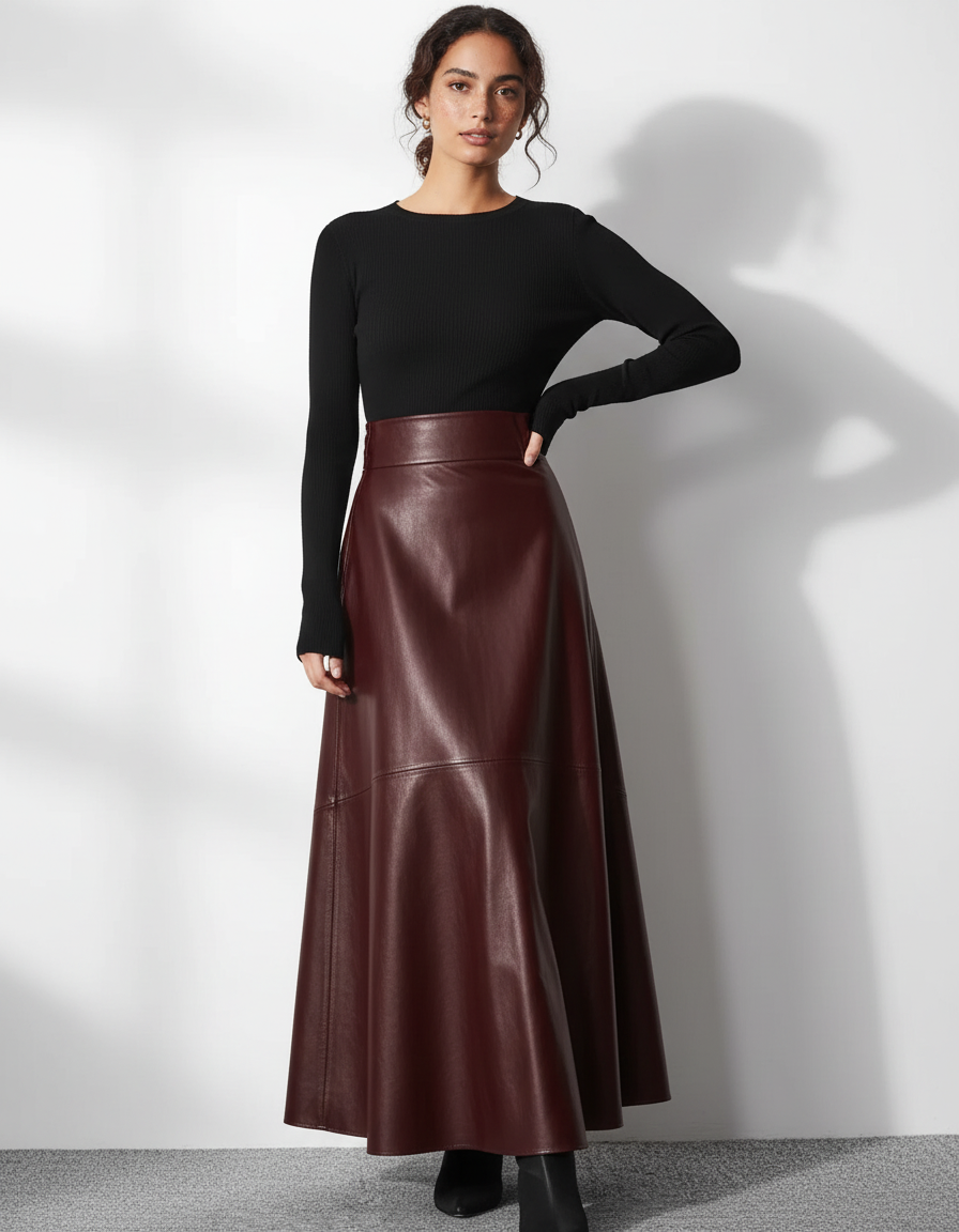 Usage de la Jupe Longue Bordeaux Simili Cuir Élégante