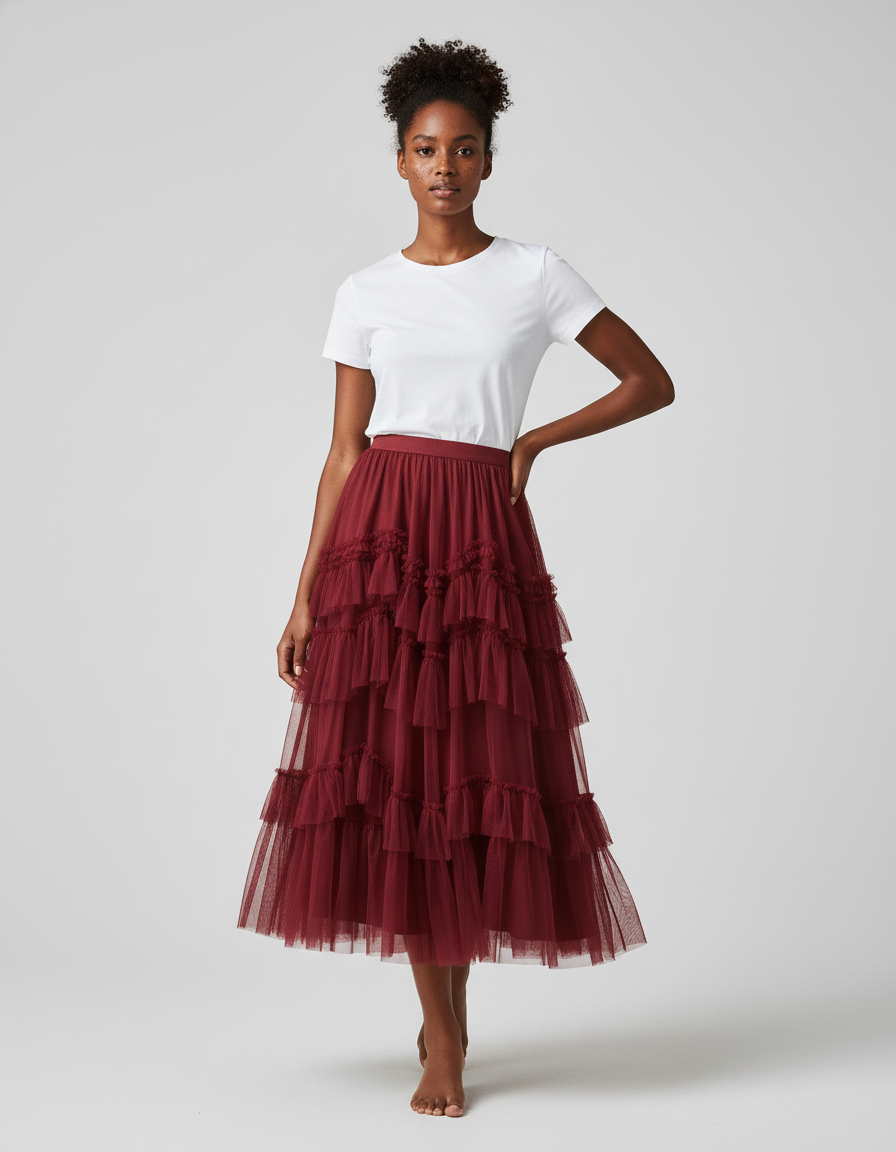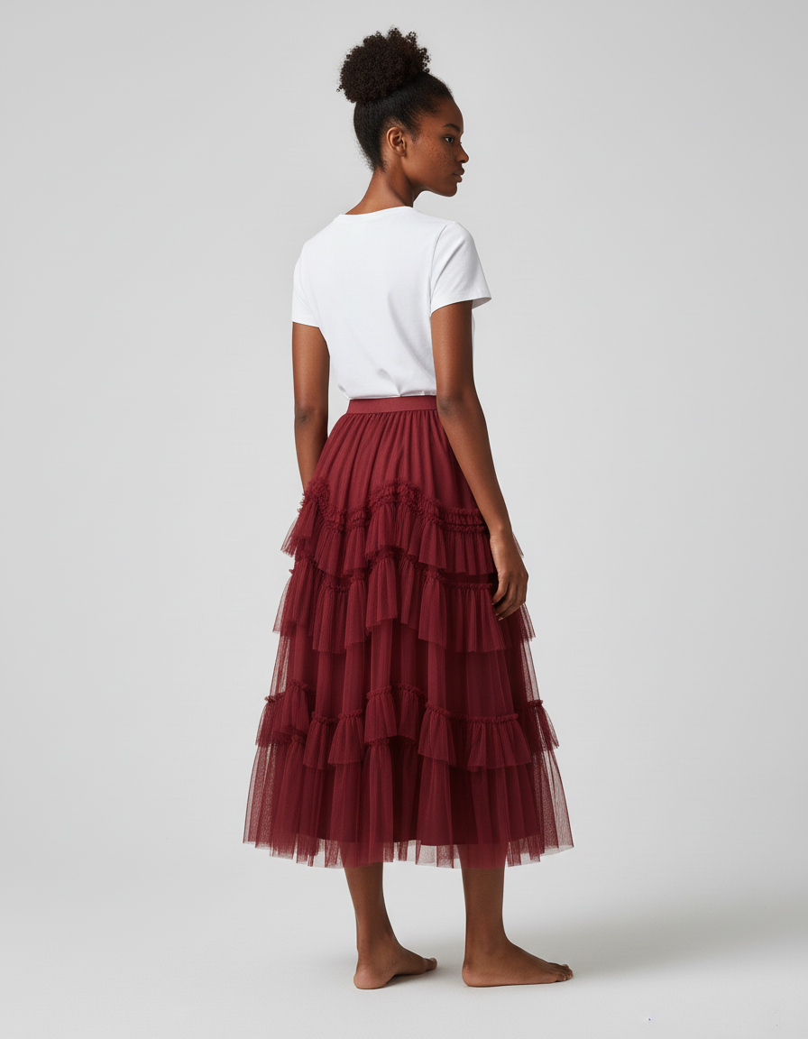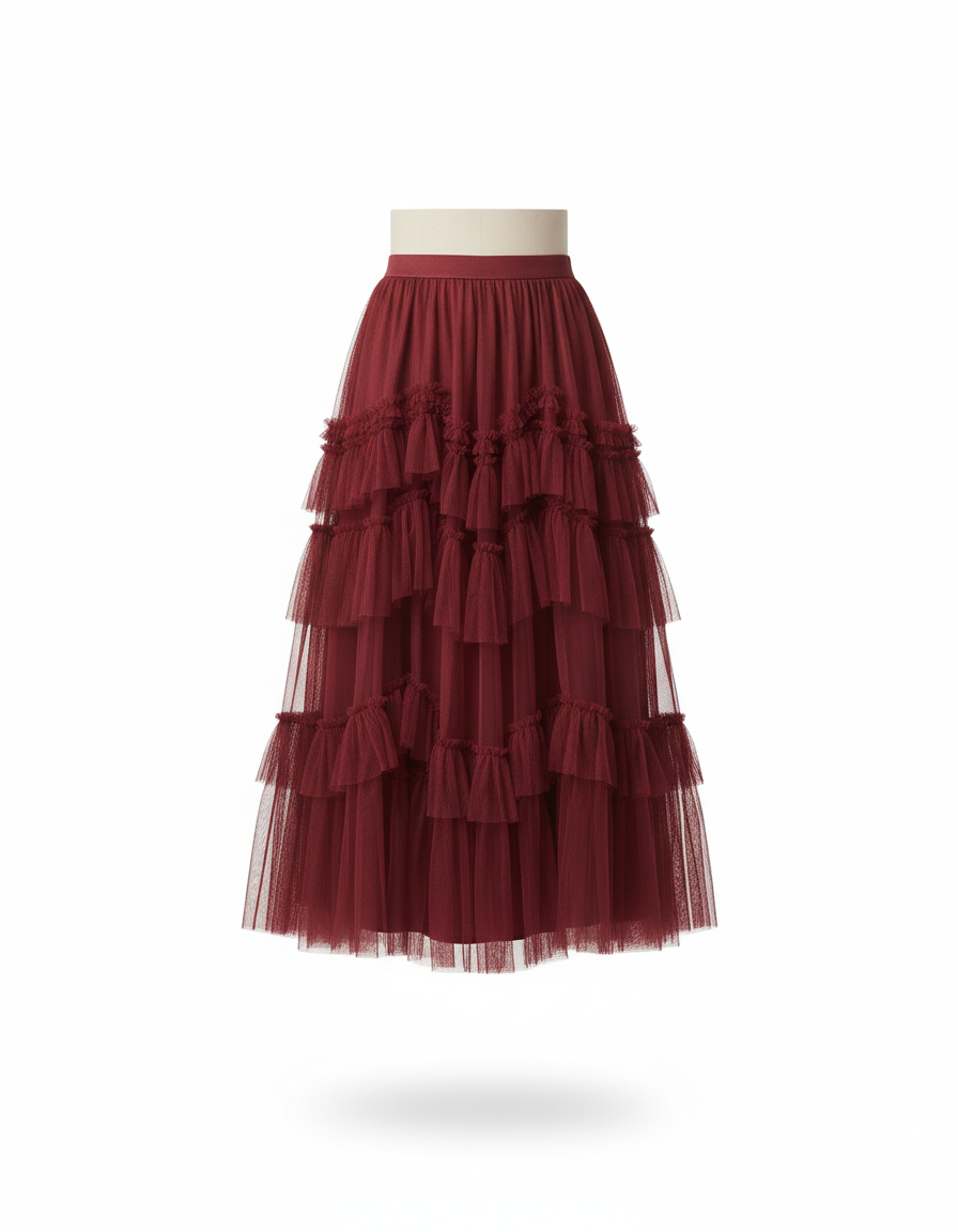 Jupe Longue Bordeaux Volants Élégante : L'Éclat d'une Féminité Réinventée