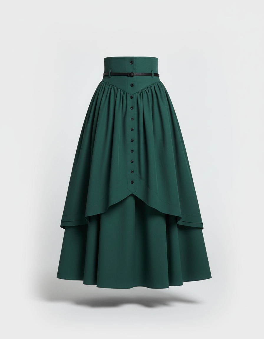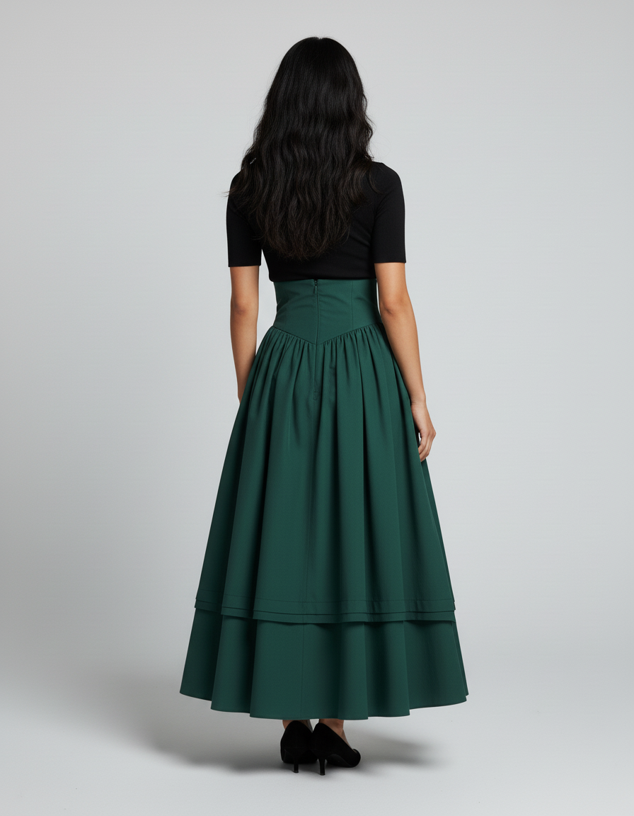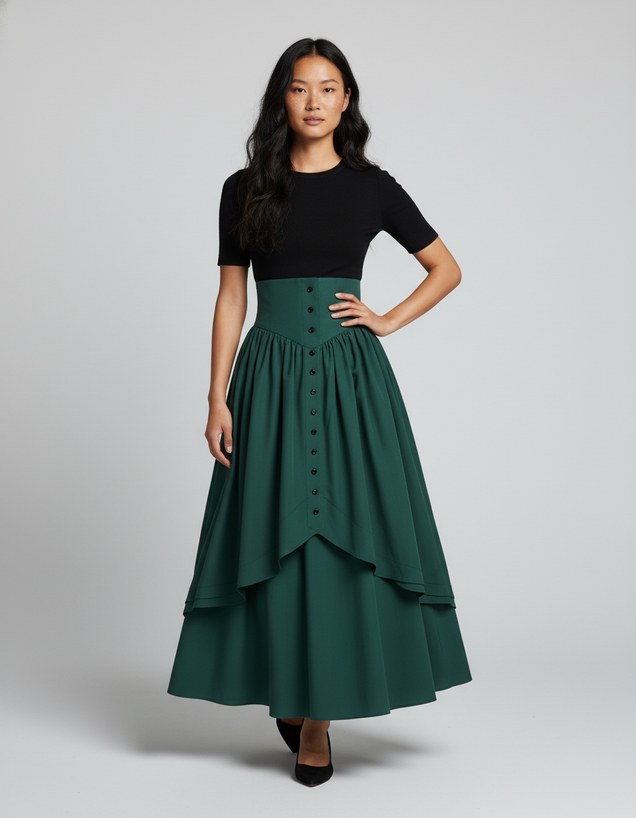 Ce qui distingue véritablement cette jupe verte luxuriante, c'est son design bouffant unique, rehaussé par une rangée de boutons délicatement alignés qui parcourent la taille haute structurée. Chaque bouton n'est pas seulement un détail, mais une invitation à un style personnalisable et une touche d'originalité. Le jeu de superpositions crée un volume spectaculaire sans être imposant, faisant de chaque pas une déclaration de grâce et de confiance. Une pièce intemporelle, conçue pour celles qui célèbrent l'art de s'habiller avec intention et un sens aigu du détail.