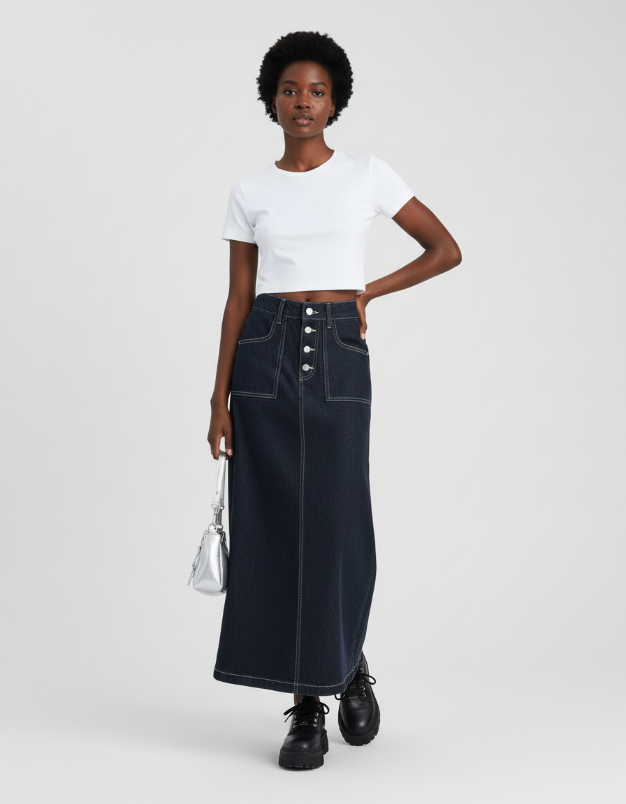 La Jupe Longue Boutons Devant, avec sa coupe droite intemporelle et sa taille haute flatteuse en jean bleu marine, est la toile parfaite pour exprimer votre style cet hiver. Pour un look de jour sophistiqué, associez-la à un pull en cachemire douillet et des bottines en cuir. Transformez-la pour une soirée élégante avec une blouse fluide en soie et des talons aiguilles. Même avec un simple crop top blanc et des bottes chunky, comme dans l'image, elle affirme une allure moderne et audacieuse, prouvant sa polyvalence pour toutes les occasions.