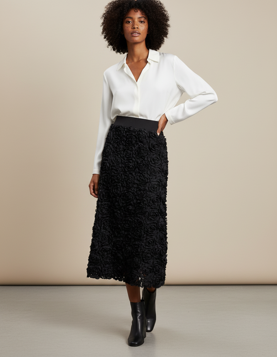 Découvrez la Jupe Longue Brodée Roses Élégante, une création où l'art de la broderie florale se marie à une coupe contemporaine. Son motif de roses en relief, d'un noir profond, confère une texture et une richesse visuelle uniques. Conçue avec une taille élastique discrète, elle garantit un confort absolu sans jamais sacrifier l'allure. Son tombé évasé, fluide et léger, accompagne chacun de vos mouvements avec une grâce naturelle, assurant une liberté totale et une silhouette élégante en toutes circonstances.