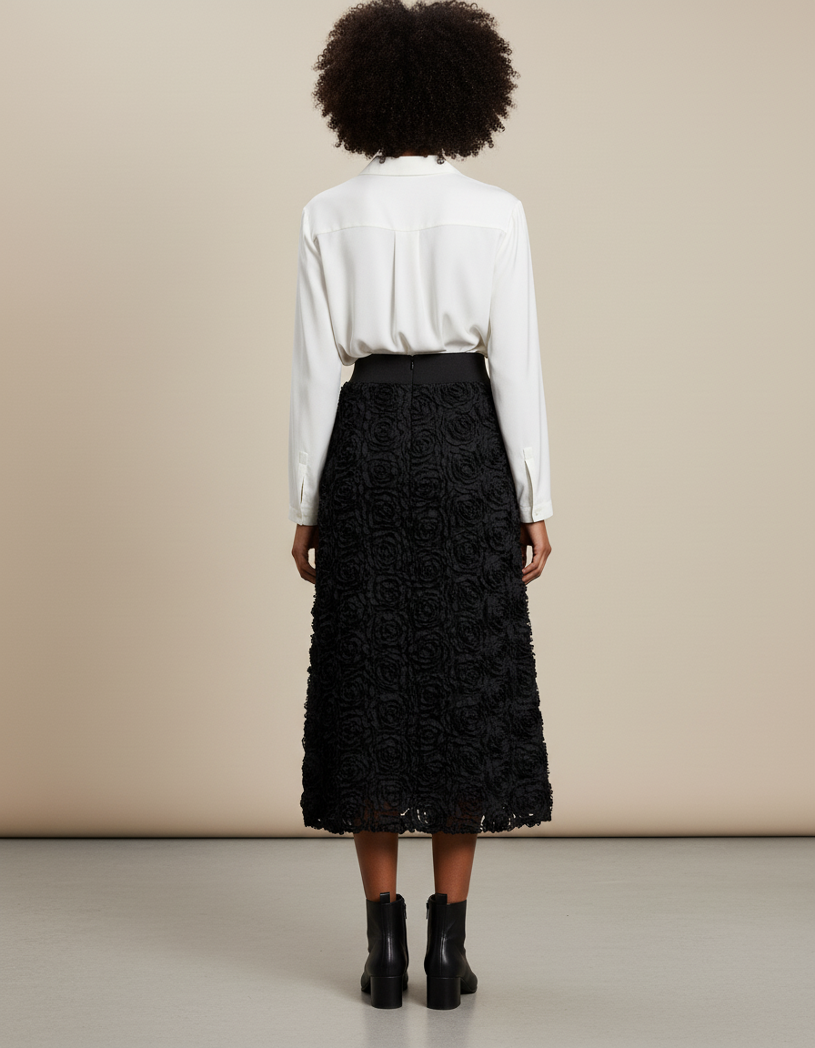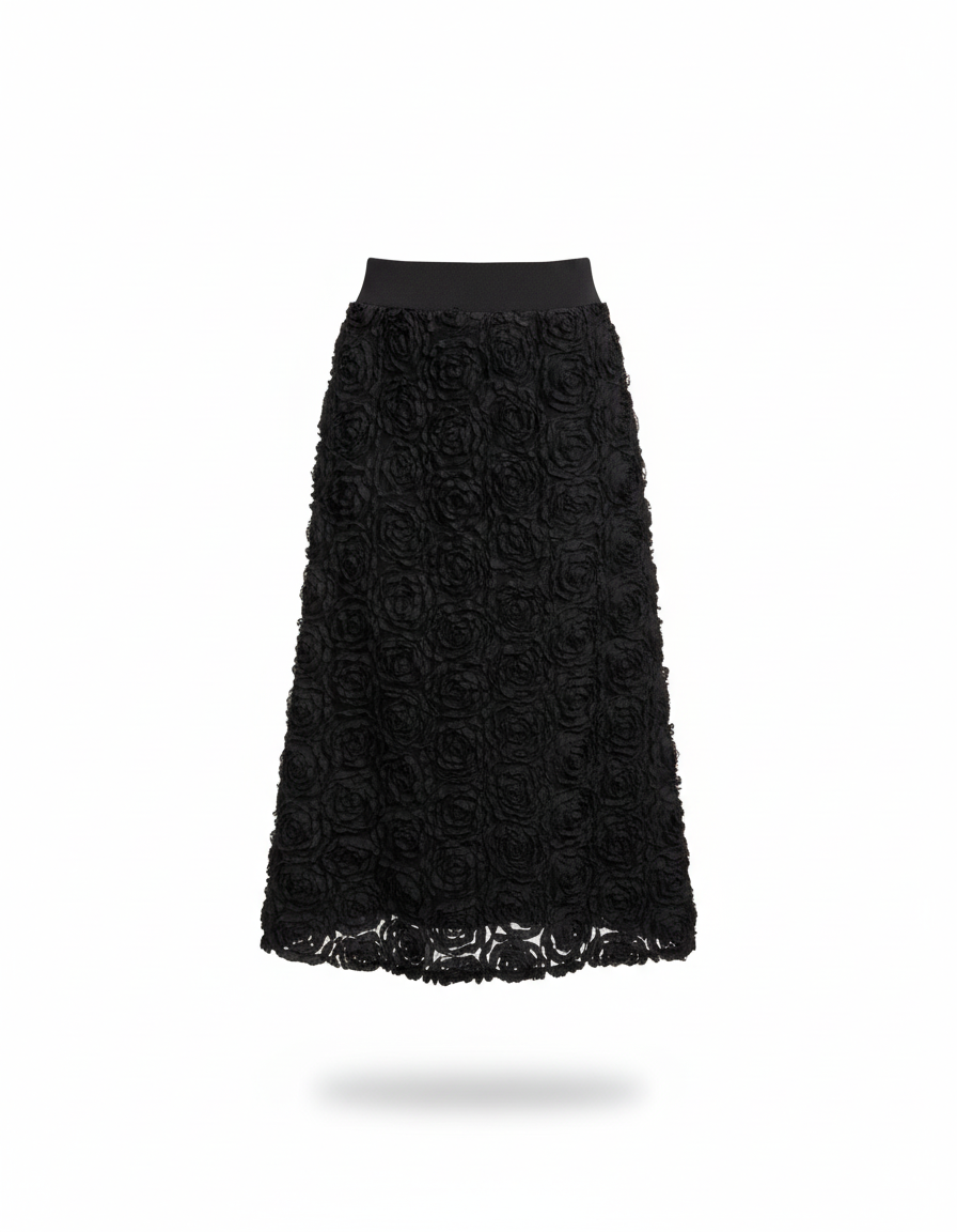 Cette jupe longue est de couleur noire et présente un motif de roses en relief sur toute sa surface.