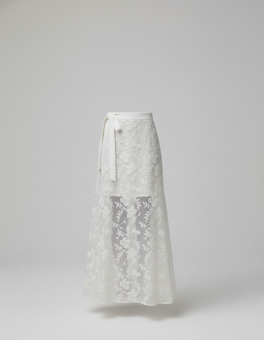 Cette jupe est une pièce longue de couleur blanche. Elle présente un motif floral brodé sur un tissu transparent.