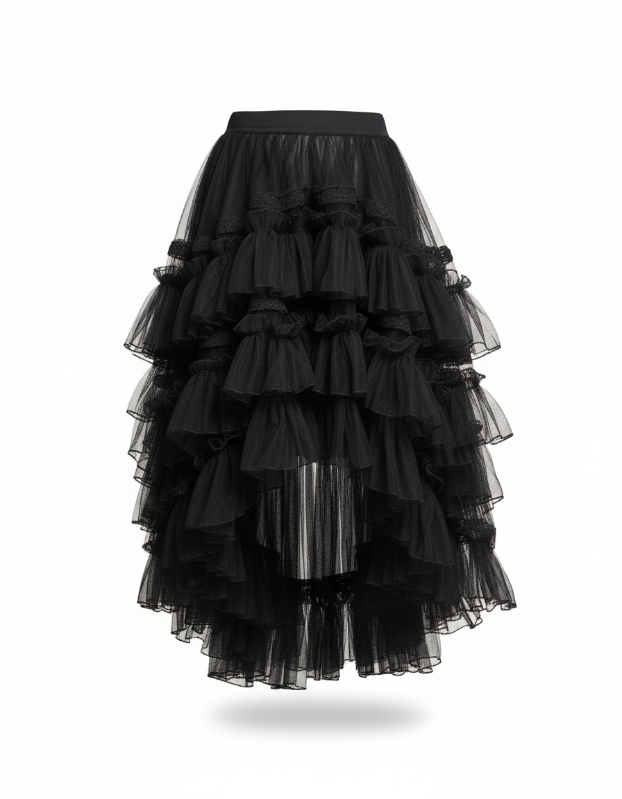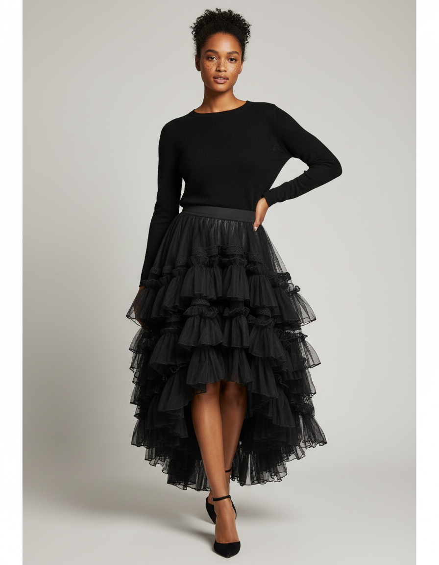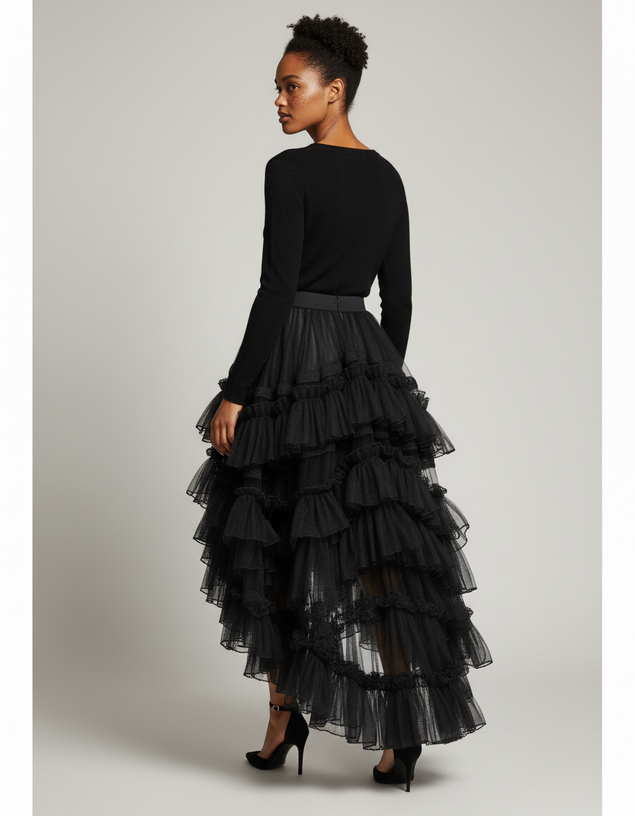 Dévoilez une allure spectaculaire avec la Jupe Longue Cabaret, une pièce maîtresse qui redéfinit le glamour moderne. Conçue pour la femme qui n'a pas peur d'exprimer sa singularité, cette jupe asymétrique en tulle noir est une véritable invitation à briller. Chaque volant, méticuleusement superposé, crée un volume somptueux et un mouvement captivant à chaque pas, vous assurant de capter tous les regards et de vous sentir irrésistiblement chic. C'est l'essence même d'une confiance affirmée.