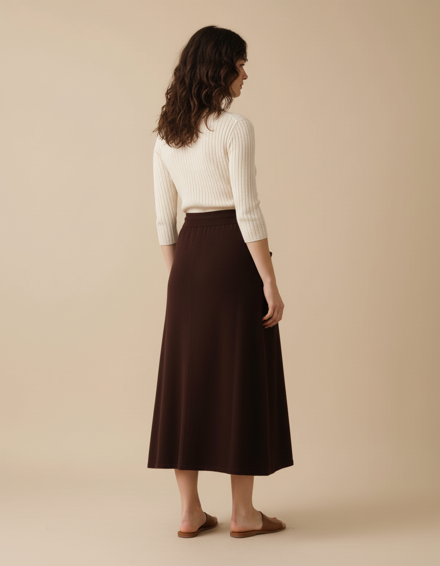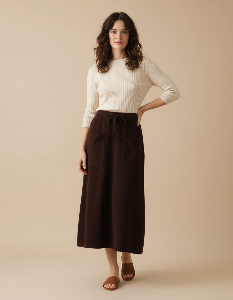 Cette Jupe Longue Cachemire est un vêtement descendant jusqu'à mi-mollet, de couleur marron foncé. Elle présente une coupe légèrement évasée et un cordon de serrage à la taille.