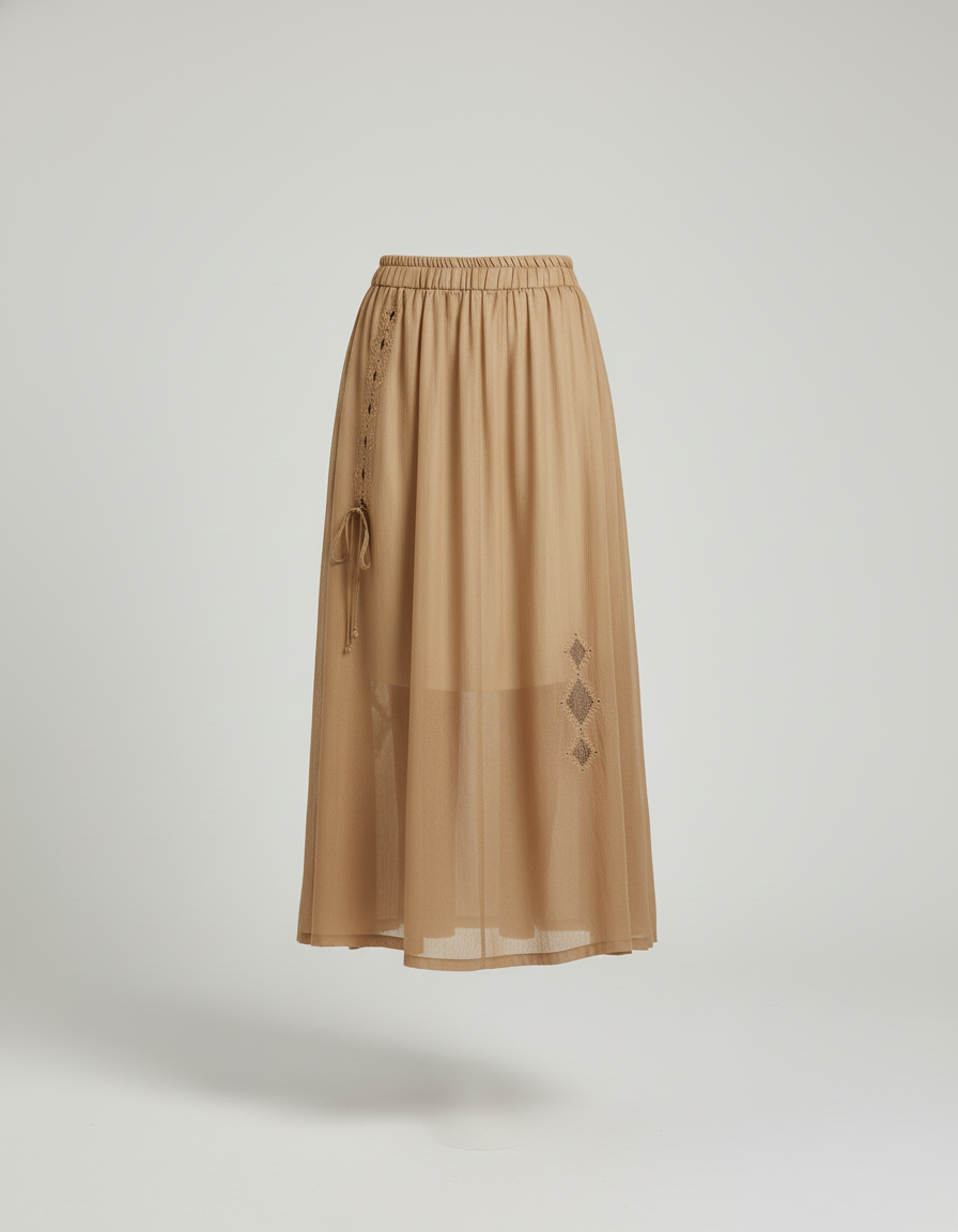 Ce qui la distingue réside dans ses détails uniques : sa teinte camel intemporelle, facile à assortir, et ses délicates broderies ton sur ton, subtilement placées, qui révèlent un savoir-faire artisanal d'exception. La transparence étudiée de sa mousseline superposée confère une dimension visuelle unique, tandis que les détails de lacet sur le côté ajoutent une touche bohème-chic discrète et ajustable. Plus qu'une jupe, elle est une invitation à exprimer votre style avec authenticité et une élégance qui transcende les saisons.