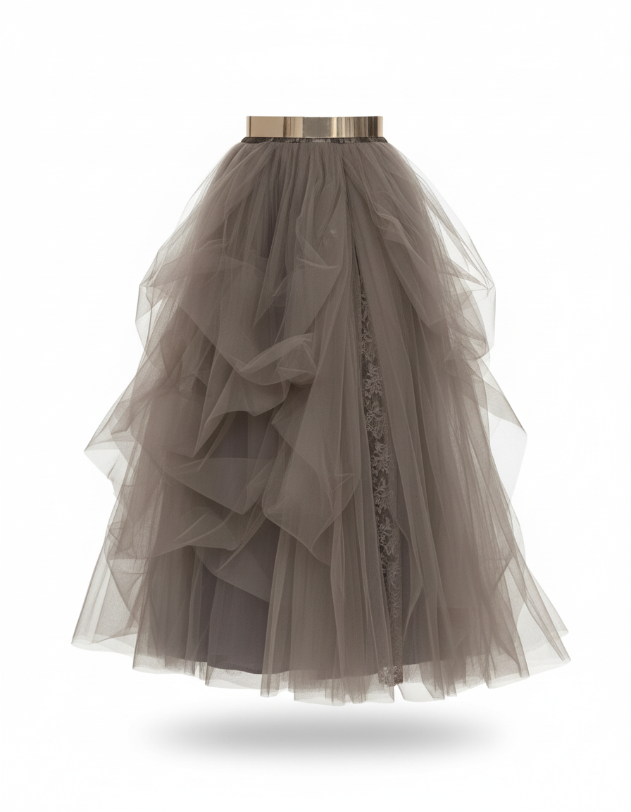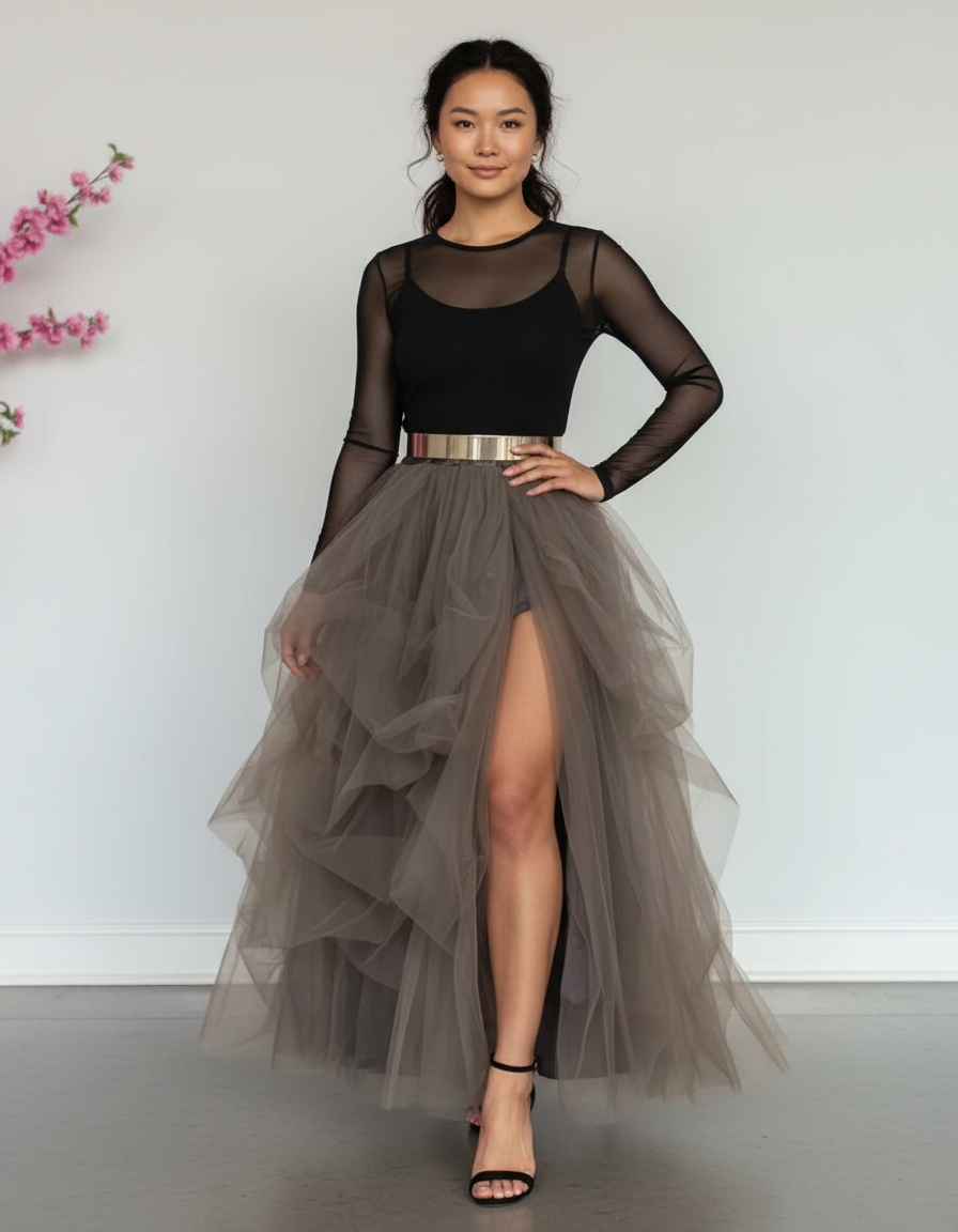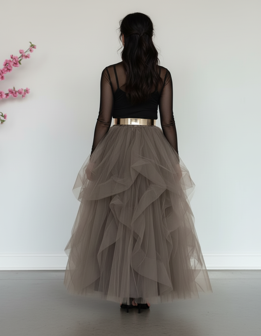 Conçue pour que vous vous sentiez aussi bien que vous en avez l'air, cette jupe en tulle offre une légèreté et une fluidité remarquables. Chaque volant est pensé pour un tombé majestueux qui suit vos mouvements avec grâce, sans jamais entraver votre pas. La ceinture dorée, non seulement sublime votre taille, mais assure également un maintien parfait. Profitez d'une liberté de mouvement absolue, permettant de danser toute la nuit ou de circuler avec aisance, tout en affichant une silhouette structurée et aérienne à la fois. Un vêtement qui allie la haute couture au bien-être.