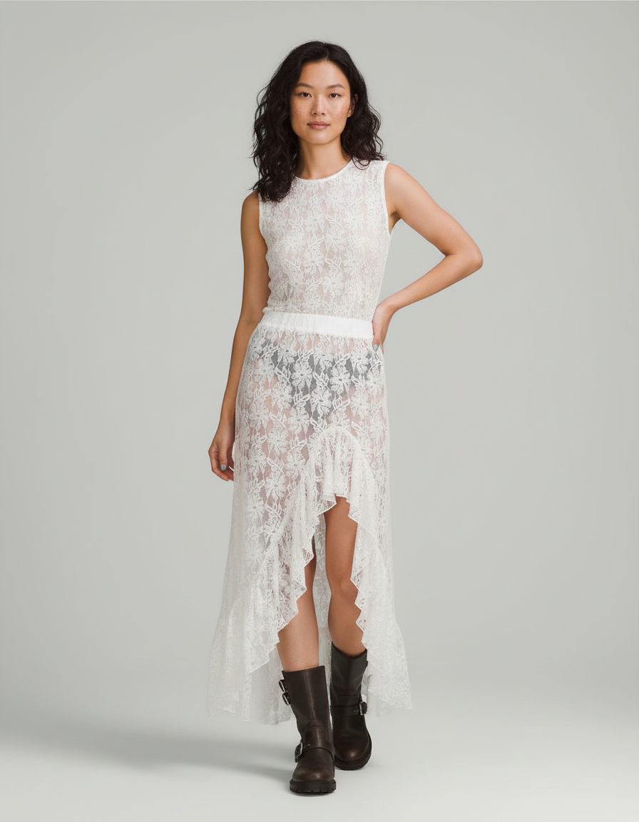 Évoquez l'esprit bohème avec notre jupe longue en dentelle vaporeuse, parfaite pour un look festivalier ou estival.