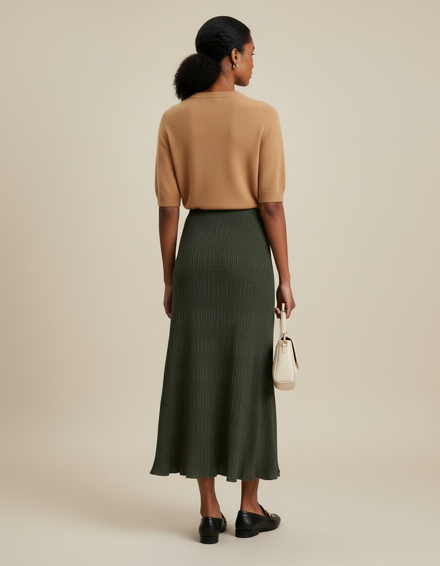 Découvrez la Jupe Longue Côtelée Évasée Chic, pièce maîtresse d'une garde-robe moderne. Conçue pour la femme qui refuse de choisir entre confort et raffinement, cette jupe offre une silhouette à la fois gracieuse et contemporaine. Son vert profond et sa maille fluide épousent délicatement chaque mouvement, vous assurant une allure impeccable du matin au soir. Idéale pour celles qui recherchent une élégance sans effort, elle s'adapte à toutes les occasions, du bureau aux dîners mondains, en passant par les escapades citadines.