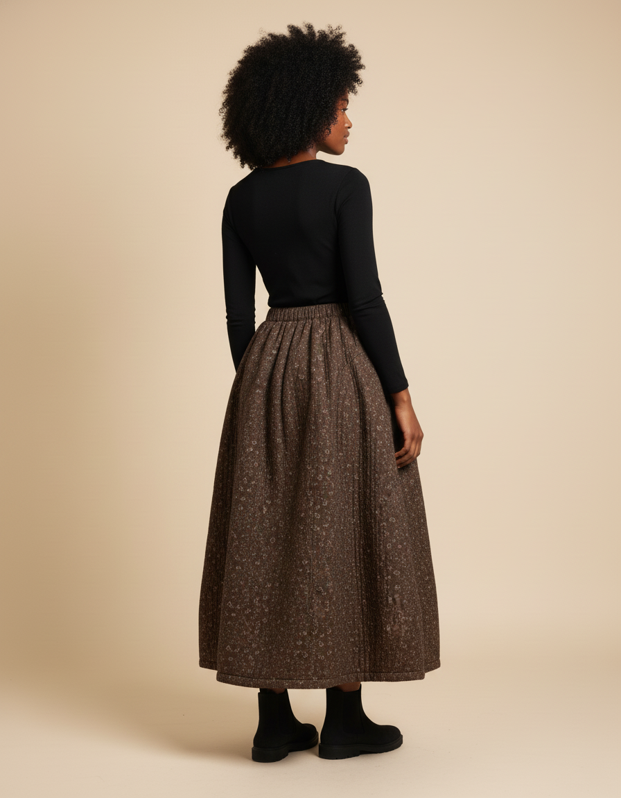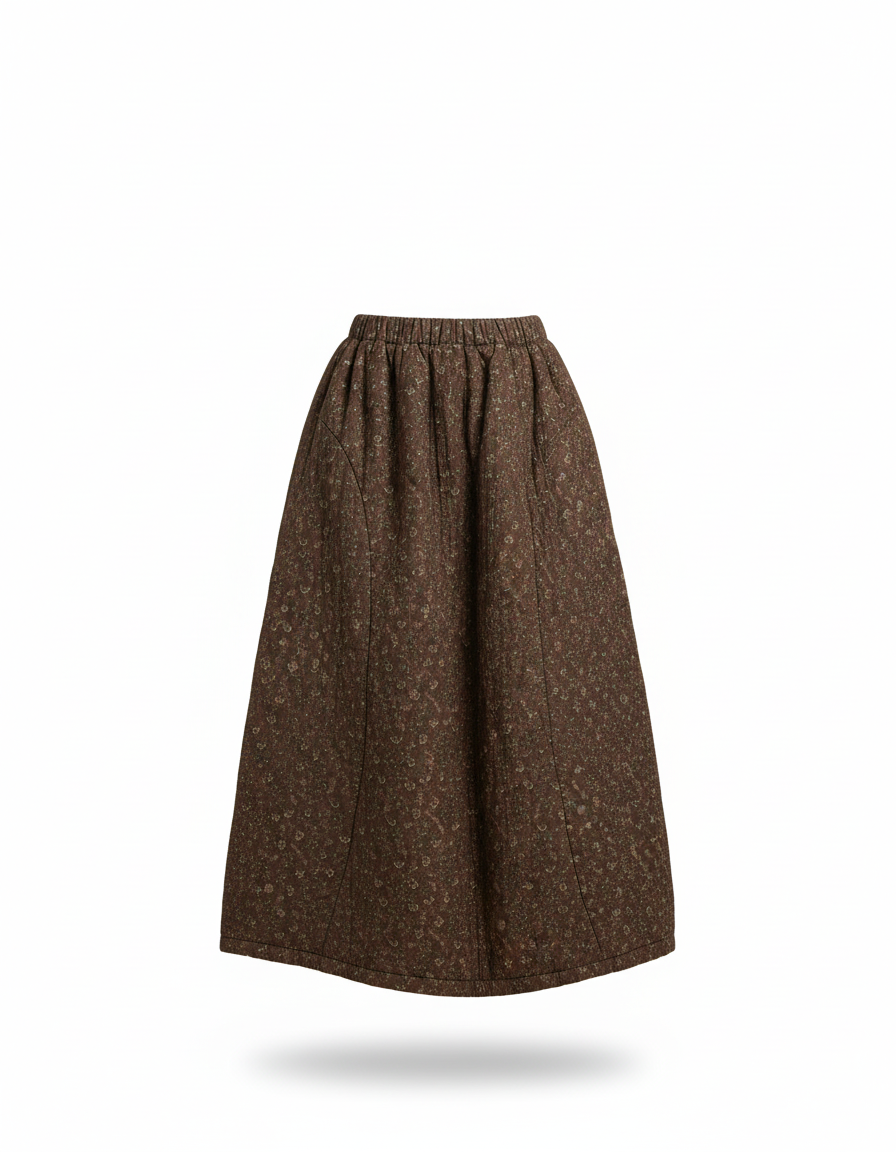 Ce qui la distingue véritablement ? Sa matière en coton matelassé, une prouesse de savoir-faire qui confère à la jupe un volume subtil et une tenue impeccable sans jamais alourdir. Le motif délicatement coloré, inspiré des traditions textiles indiennes, révèle une palette de nuances terreuses et florales, ajoutant une profondeur visuelle unique à chaque mouvement. Plus qu'une simple jupe, c'est une œuvre d'art portable, un choix conscient pour une garde-robe raffinée et durable. Idéale pour toutes les saisons, elle se prête aussi bien à une tenue décontractée chic qu'à une occasion plus habillée, incarnant un luxe discret et conscient.