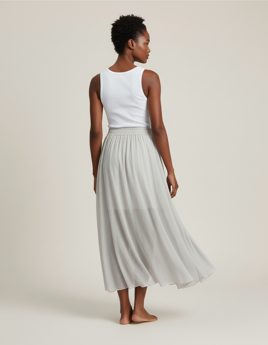 Découvrez la quintessence du chic décontracté avec notre Jupe Longue Couleur Unie. Conçue dans une mousseline aérienne d'un gris délicat, cette pièce maîtresse offre une fluidité incomparable à chaque mouvement. Sa taille élastique, discrète et parfaitement ajustée, garantit un confort absolu sans sacrifier l'élégance, vous permettant de vous sentir à l'aise et sophistiquée du matin au soir. Le tombé évasé sublime la silhouette avec une grâce naturelle, créant une allure à la fois moderne et intemporelle.