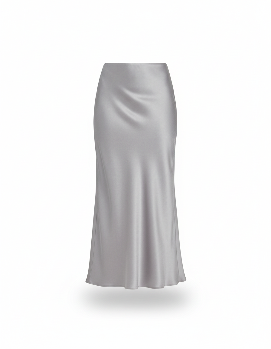 Cette jupe est un vêtement long de couleur grise, présentant une coupe sirène. Le tissu possède un aspect lisse et brillant.