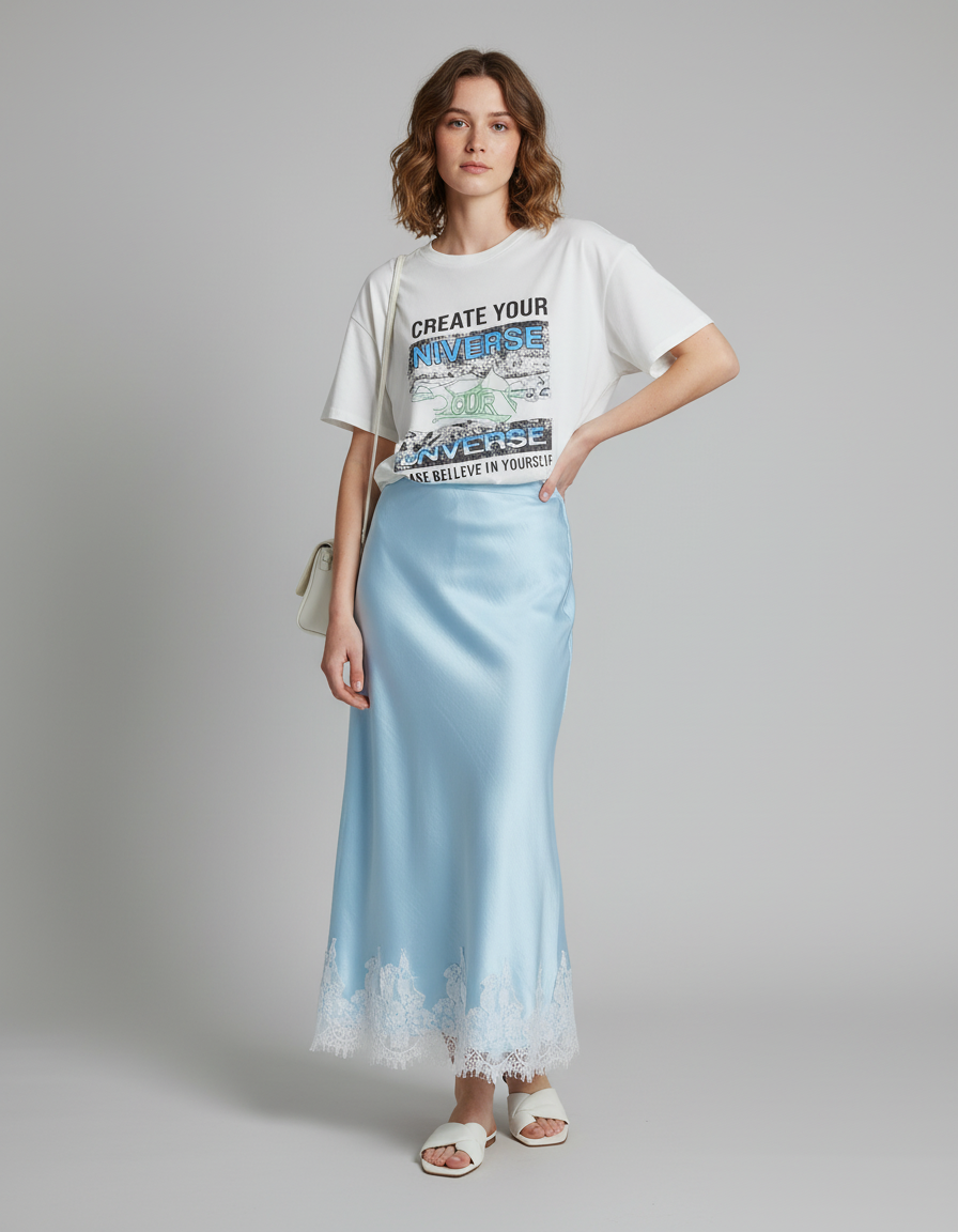 La Jupe Longue Créateur, avec son satin fluide d'un bleu envoûtant, est bien plus qu'une tenue de cérémonie. Pour les grands jours, mariez-la à une blouse raffinée et des escarpins pour une élégance intemporelle. Mais sa vraie force réside dans sa polyvalence : imaginez-la avec un t-shirt graphique audacieux et des sandales plates pour un style urbain-chic décontracté, comme une invitation à réinventer le quotidien. Une veste en jean ou un blazer léger complétera parfaitement cette allure moderne, vous permettant de passer du jour à la nuit avec une aisance remarquable.