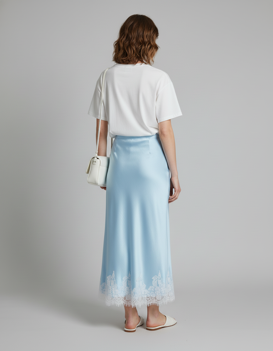 Cette jupe longue en satin bleu clair est une pièce élégante et polyvalente pour votre garde-robe.