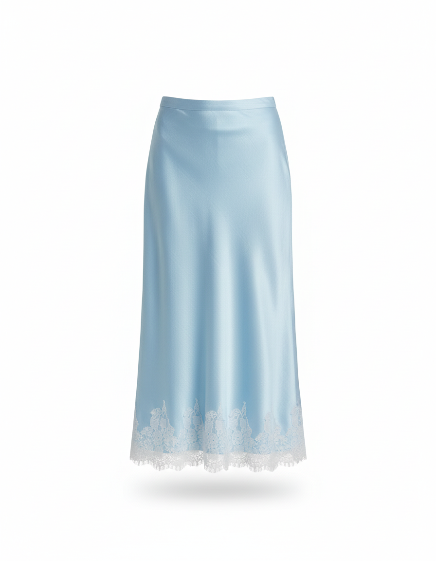 Cette jupe longue présente une couleur bleu clair et un ourlet décoré de dentelle blanche. Elle est conçue avec une taille élastiquée pour un ajustement souple.