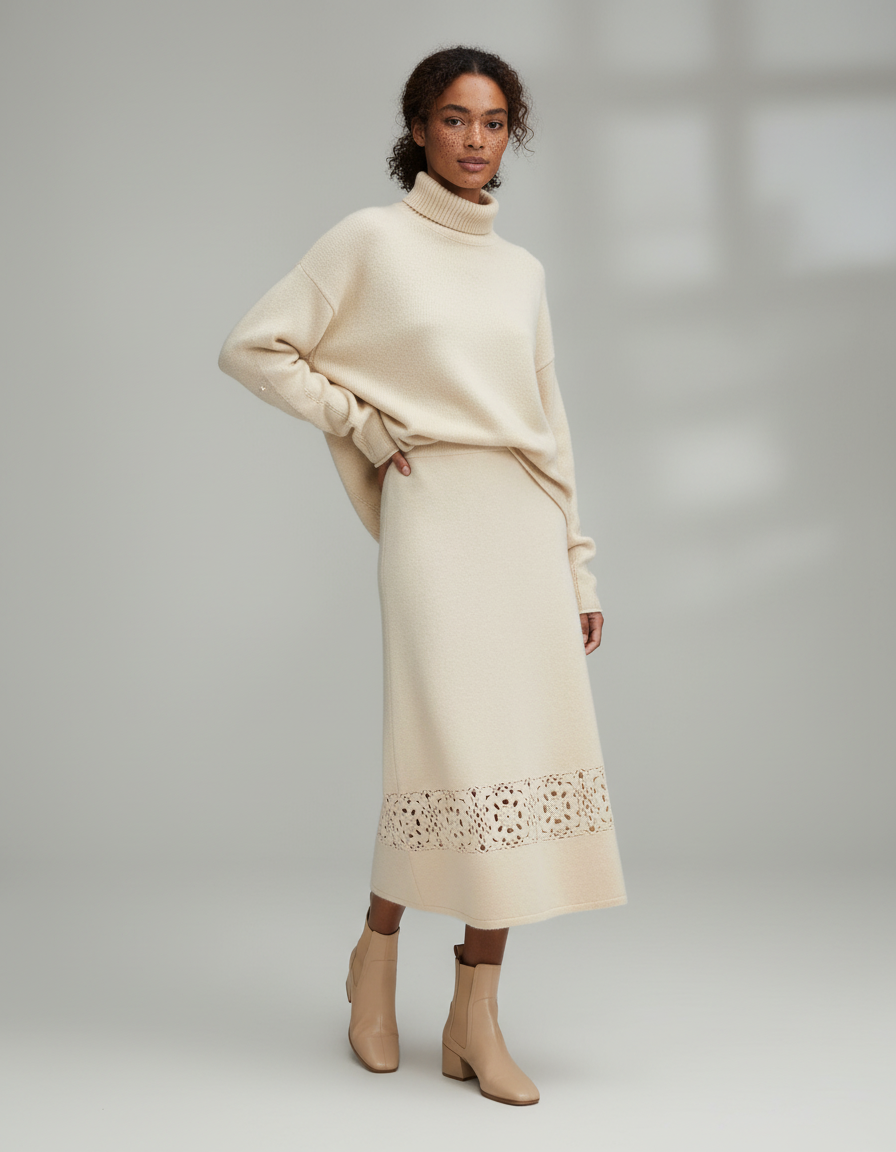 La Jupe Longue Crème Ajourée Élégante se révèle être un véritable caméléon stylistique, parfaite pour l'hiver. Pour un ensemble douillet et raffiné au quotidien, mariez cette jupe fluide en maille beige à un pull oversize en cachemire et des bottines en cuir, comme illustré, pour une allure décontractée chic. Pour une occasion spéciale ou une soirée, métamorphosez-la en l'associant à un chemisier en soie fluide ou un top ajusté en satin, complété par des escarpins ou des bottes hautes, afin de mettre en valeur son sublime motif ajouré et d'affirmer une élégance intemporelle et sophistiquée.