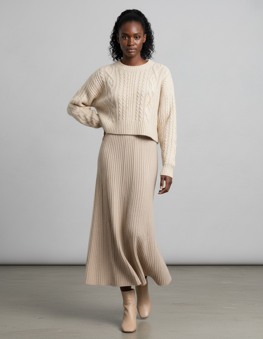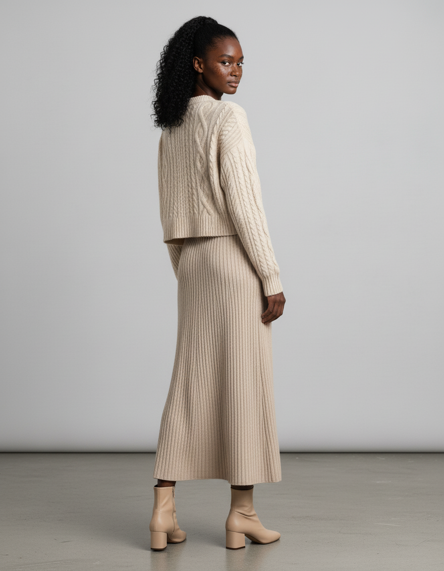 Conçue pour l'hiver, notre Jupe Longue Crème Côtelée Fluide enveloppe votre silhouette d'une douceur incomparable. Sa maille côtelée de qualité supérieure assure un tombé parfait, épousant vos courbes avec délicatesse sans jamais entraver vos mouvements. Profitez d'une liberté totale, que ce soit pour une journée active ou un après-midi détente. Sa coupe évasée offre une élégance naturelle à chaque pas, garantissant un confort absolu du matin au soir.