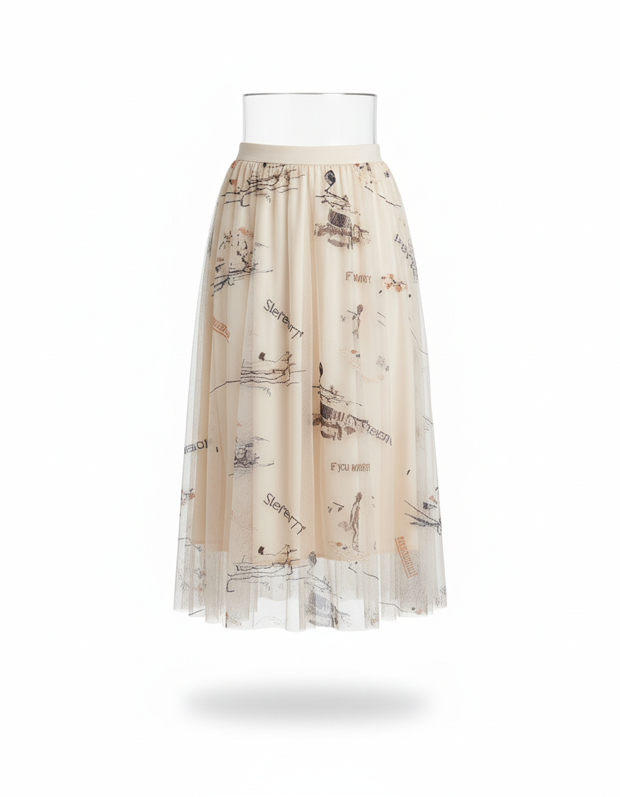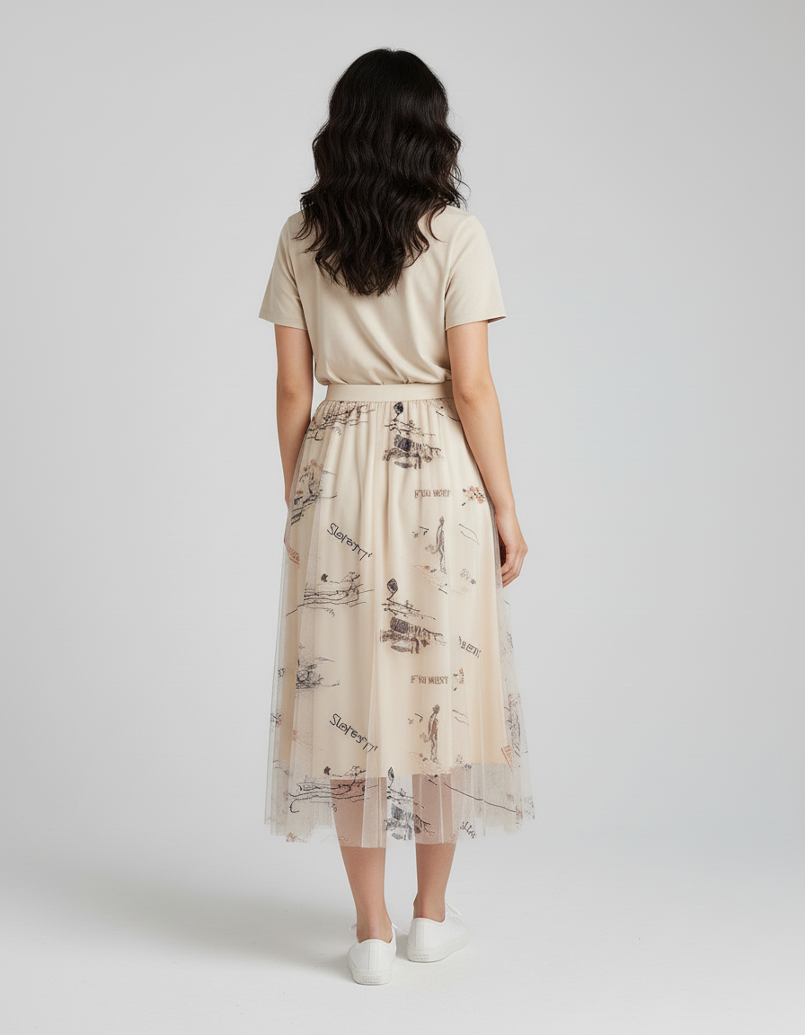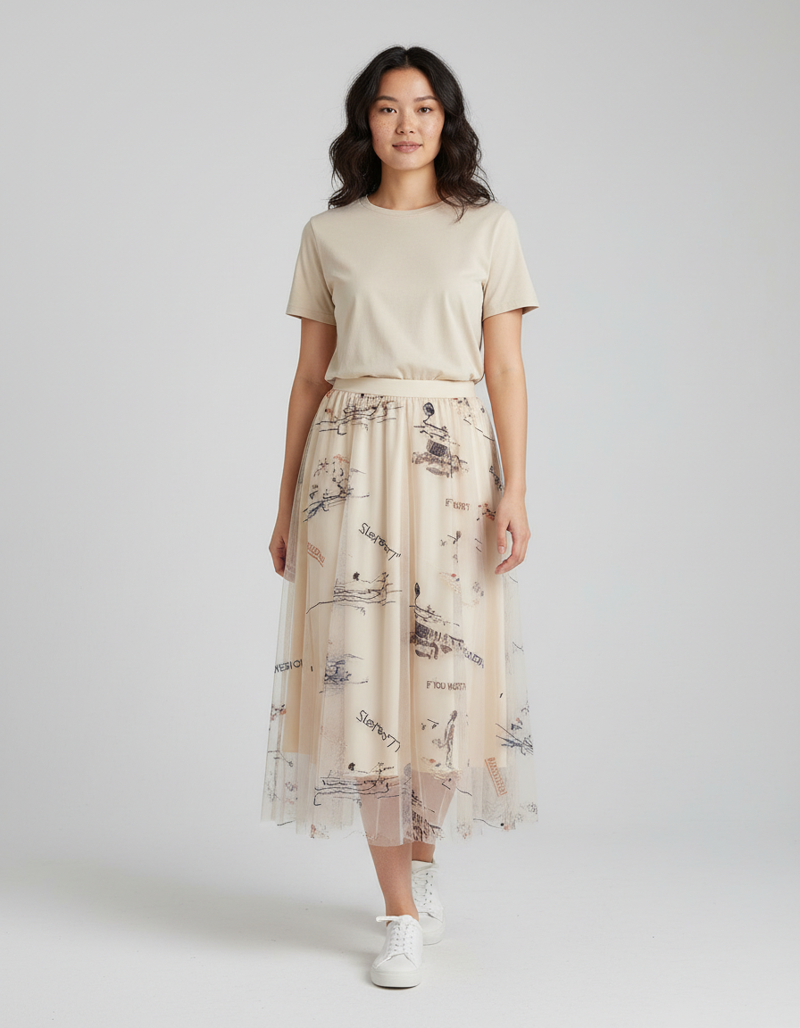 Imaginez une silhouette qui danse avec chaque pas, une élégance naturelle qui ne fait aucun compromis sur le confort. La Jupe Longue Crème Imprimée Fluide est une ode à la légèreté et à l'expression personnelle. Confectionnée dans un tulle aérien, sa coupe évasée offre une fluidité exquise, tandis que son imprimé artistique et délicat, aux nuances subtiles, raconte une histoire unique à chaque femme qui la porte. C'est la pièce maîtresse pour celles qui recherchent une sophistication décontractée, une allure qui attire le regard sans effort.