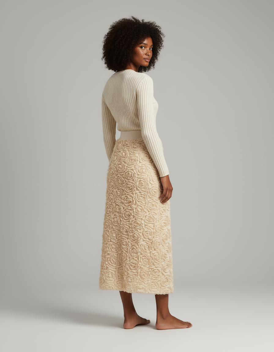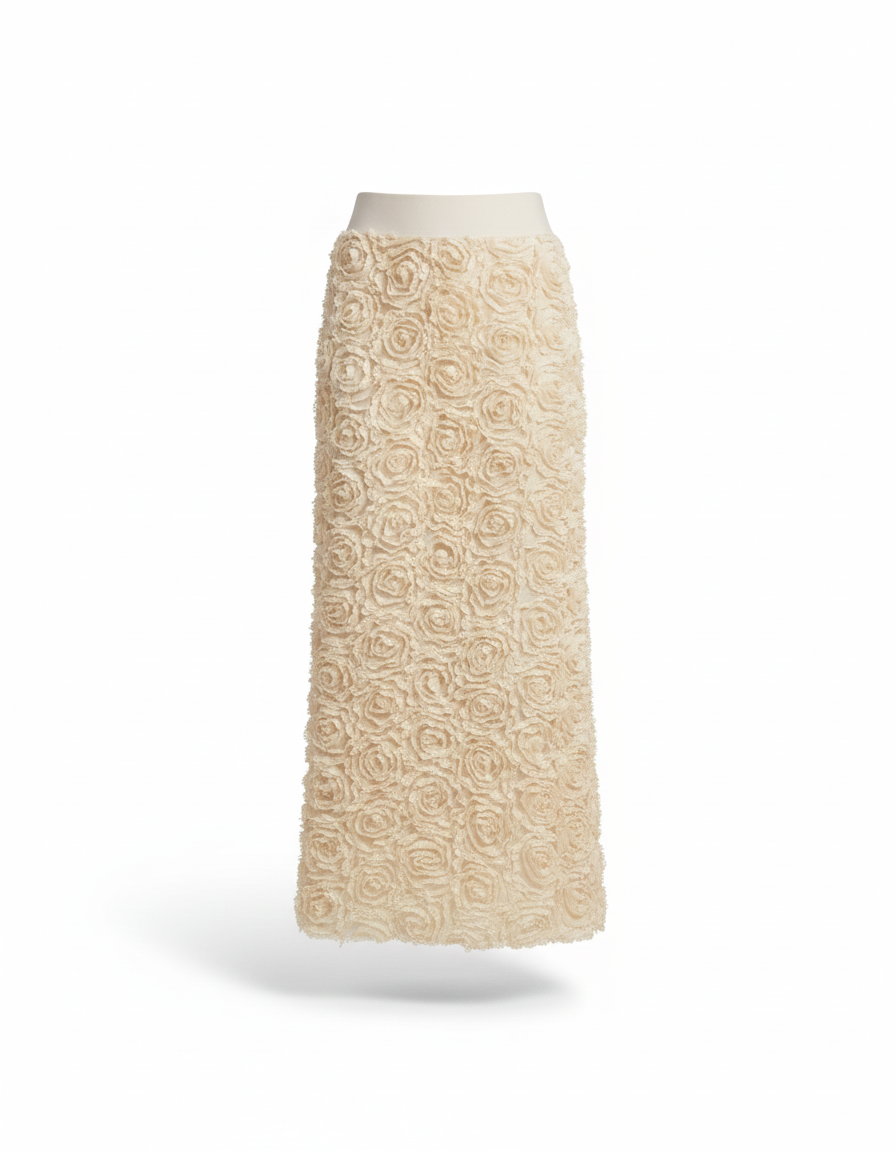 Jupe Longue Crème Roses 3D Élégante : L'Art de la Subtilité Luxueuse