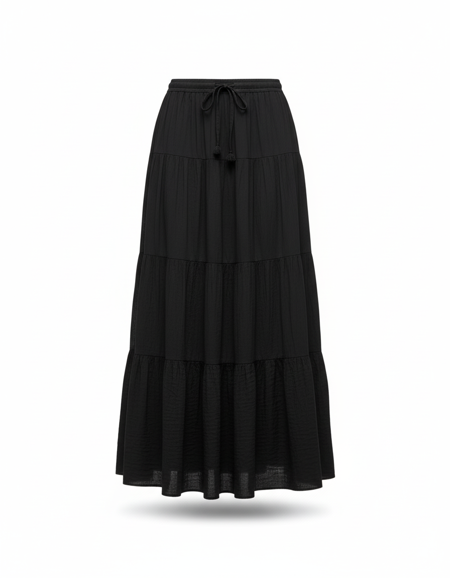 Confectionnée dans un somptueux crêpe de coton noir, notre Jupe Longue incarne la fluidité et le confort absolu. Sa matière légère et respirante épouse vos mouvements avec une grâce naturelle, vous offrant une liberté totale tout au long de la journée. Le tombé impeccable de ses volants superposés crée une silhouette aérienne et élégante, qui danse au gré de vos pas sans jamais entraver votre allure. Une pièce pensée pour celles qui ne transigent ni sur le style, ni sur le bien-être.