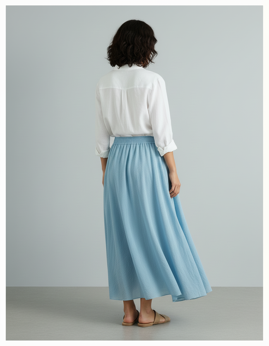 Ce qui distingue notre Jupe Longue Crepon, c'est l'alliance parfaite entre son esthétique soignée et sa praticité. La taille élastique, discrètement intégrée, assure un ajustement parfait et un confort absolu, épousant délicatement la silhouette sans jamais serrer. Oubliez les compromis : cette jupe est pensée pour vous accompagner du matin au soir avec une élégance naturelle. Son coloris bleu apaisant se marie aisément avec une multitude de tops, faisant d'elle le pilier d'une garde-robe chic et intemporelle, une pièce maîtresse qui célèbre la liberté de mouvement et la sophistication discrète.