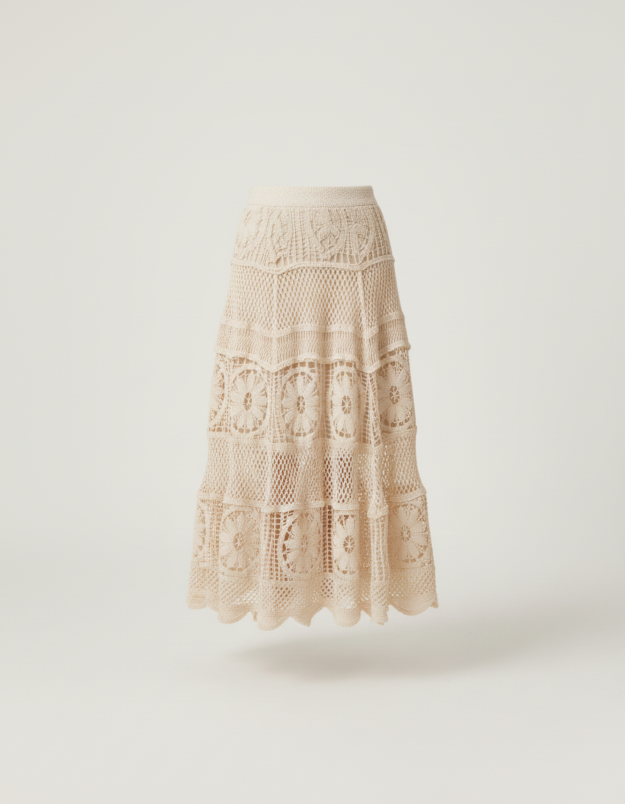 Cette jupe est une pièce longue confectionnée en crochet. Elle présente une teinte beige et une structure composée de plusieurs niveaux de motifs.