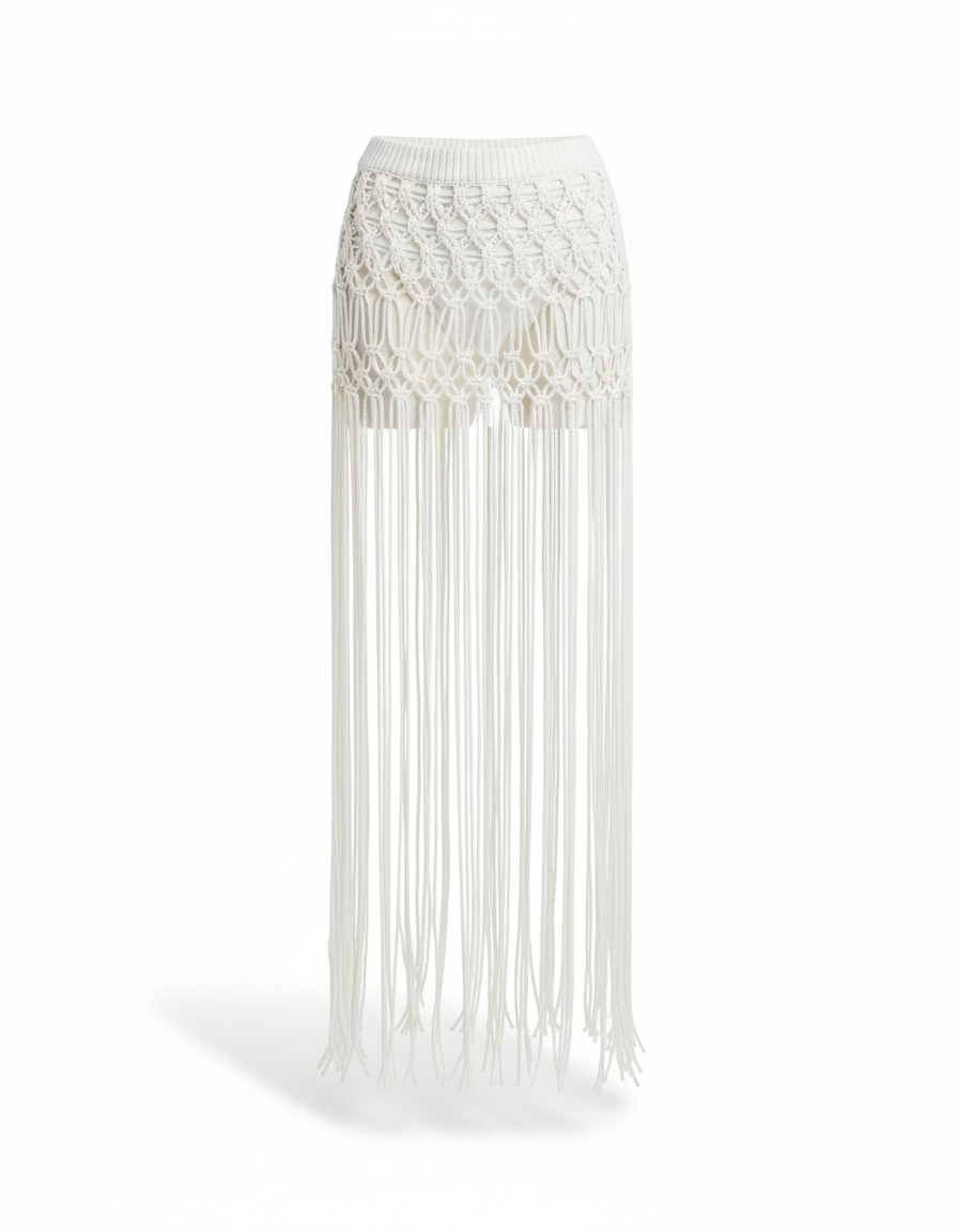 Cette jupe longue est conçue avec une technique de crochet, présentant des franges s'étendant jusqu'aux chevilles. Elle est de couleur blanche et se noue à la taille.