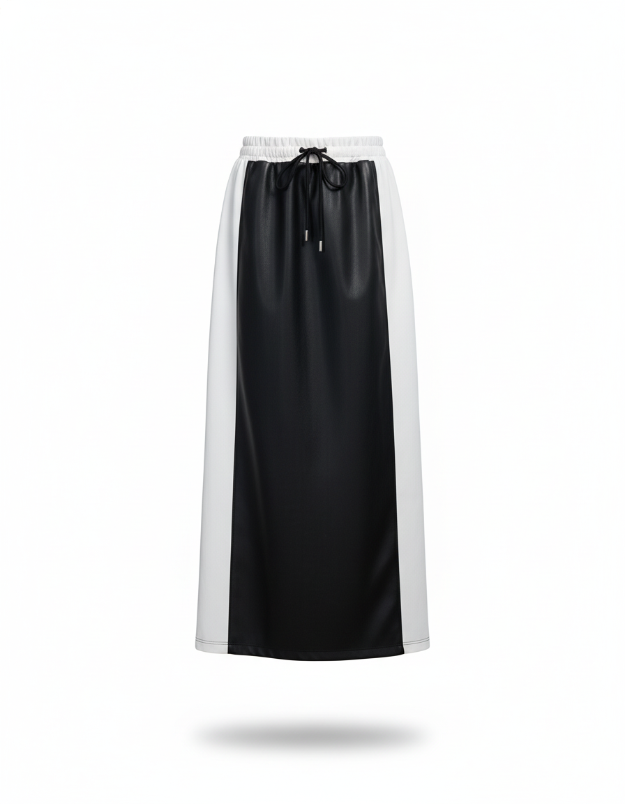 Affirmez votre style avec notre jupe longue en similicuir bicolore, parfaite pour une allure contemporaine et audacieuse.
