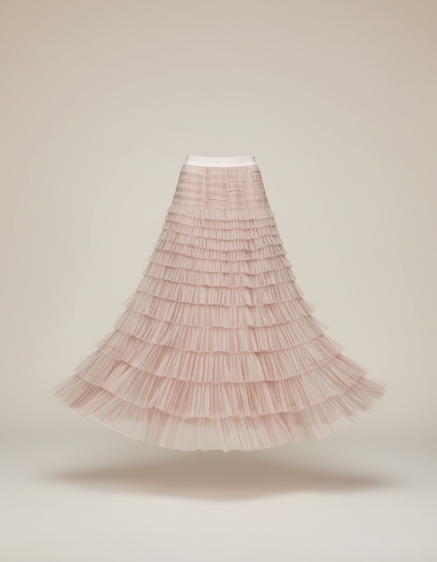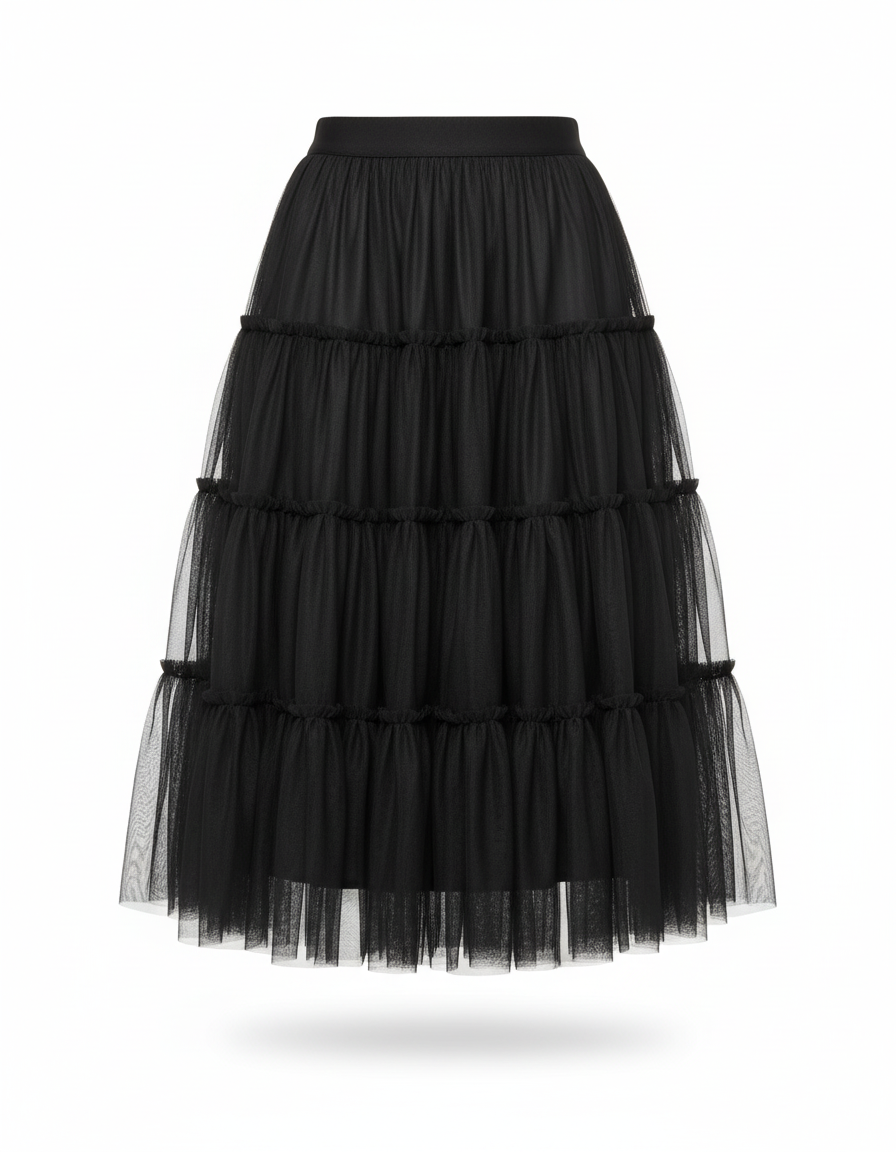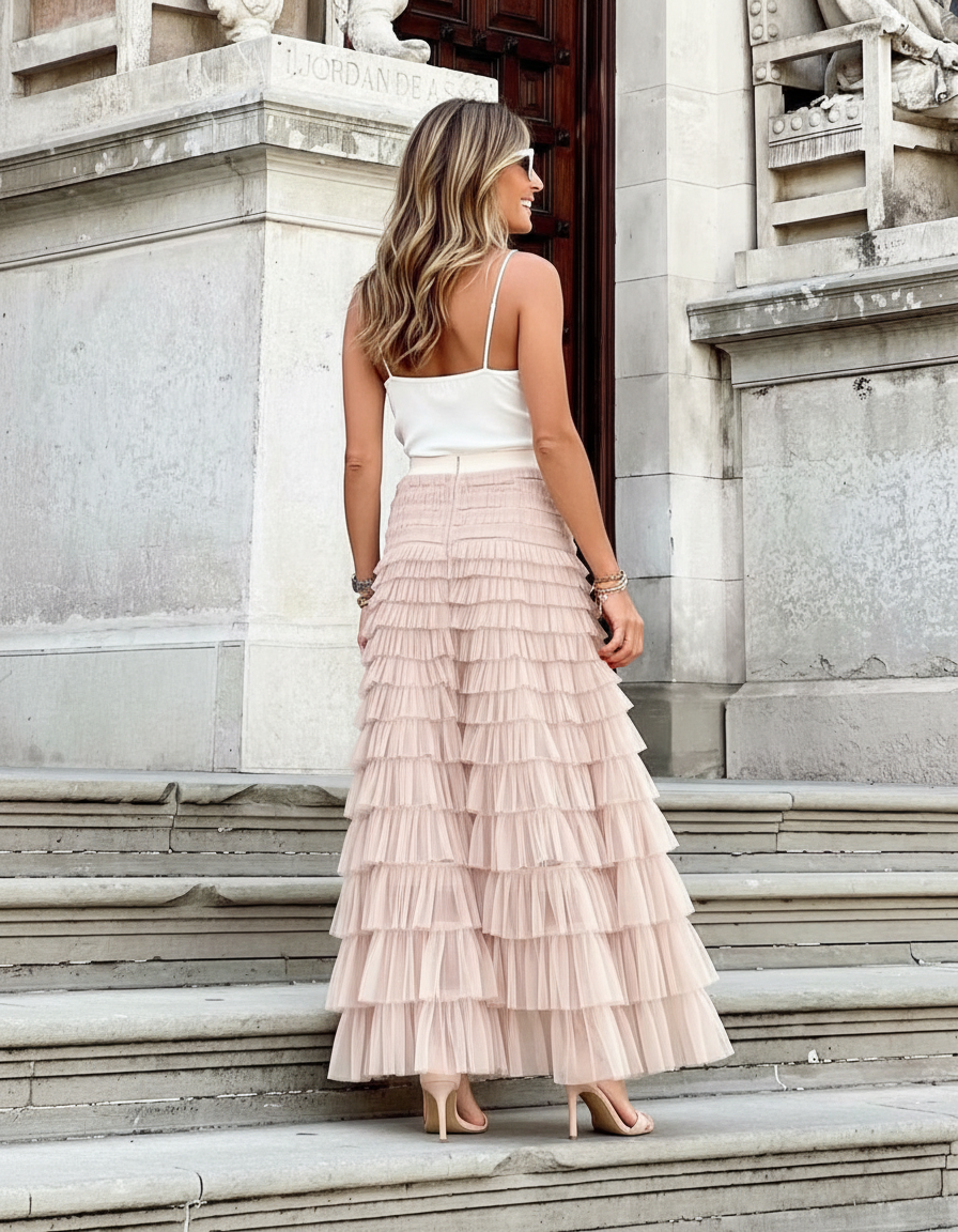 Sublimez votre look avec notre jupe longue en tulle à volants, idéale pour un style élégant et aérien.