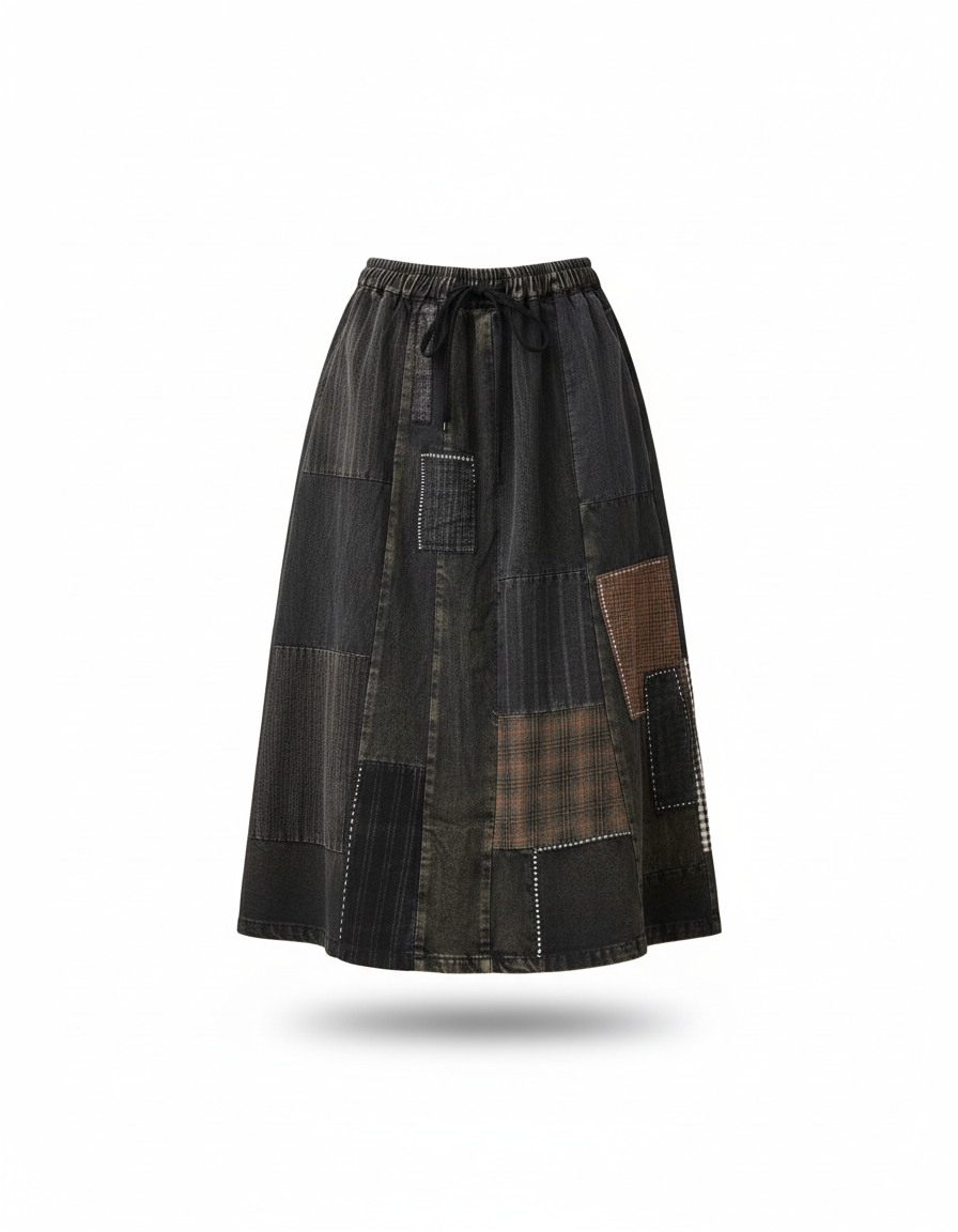 Adoptez un style unique et décontracté avec notre jupe longue en denim patchwork noir.